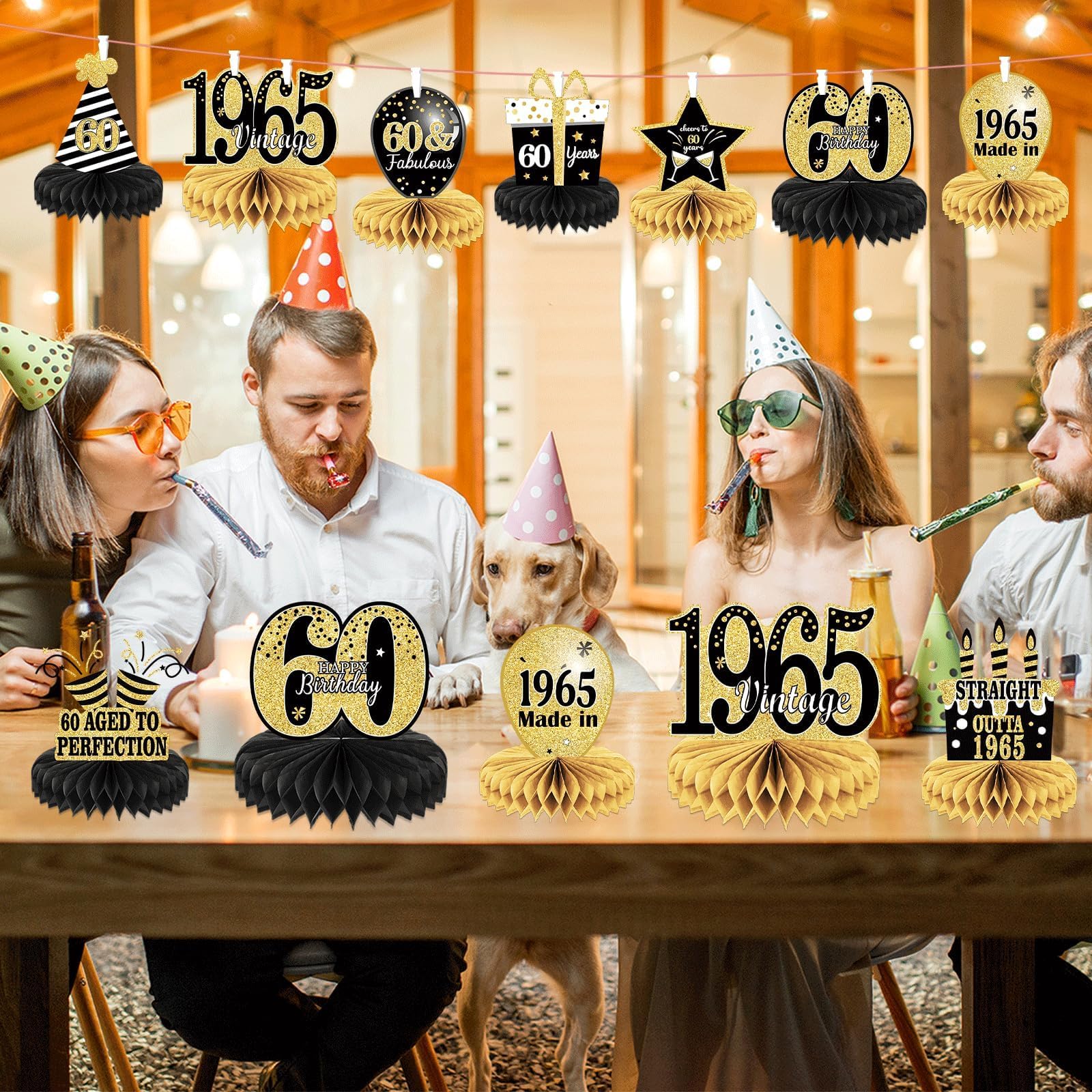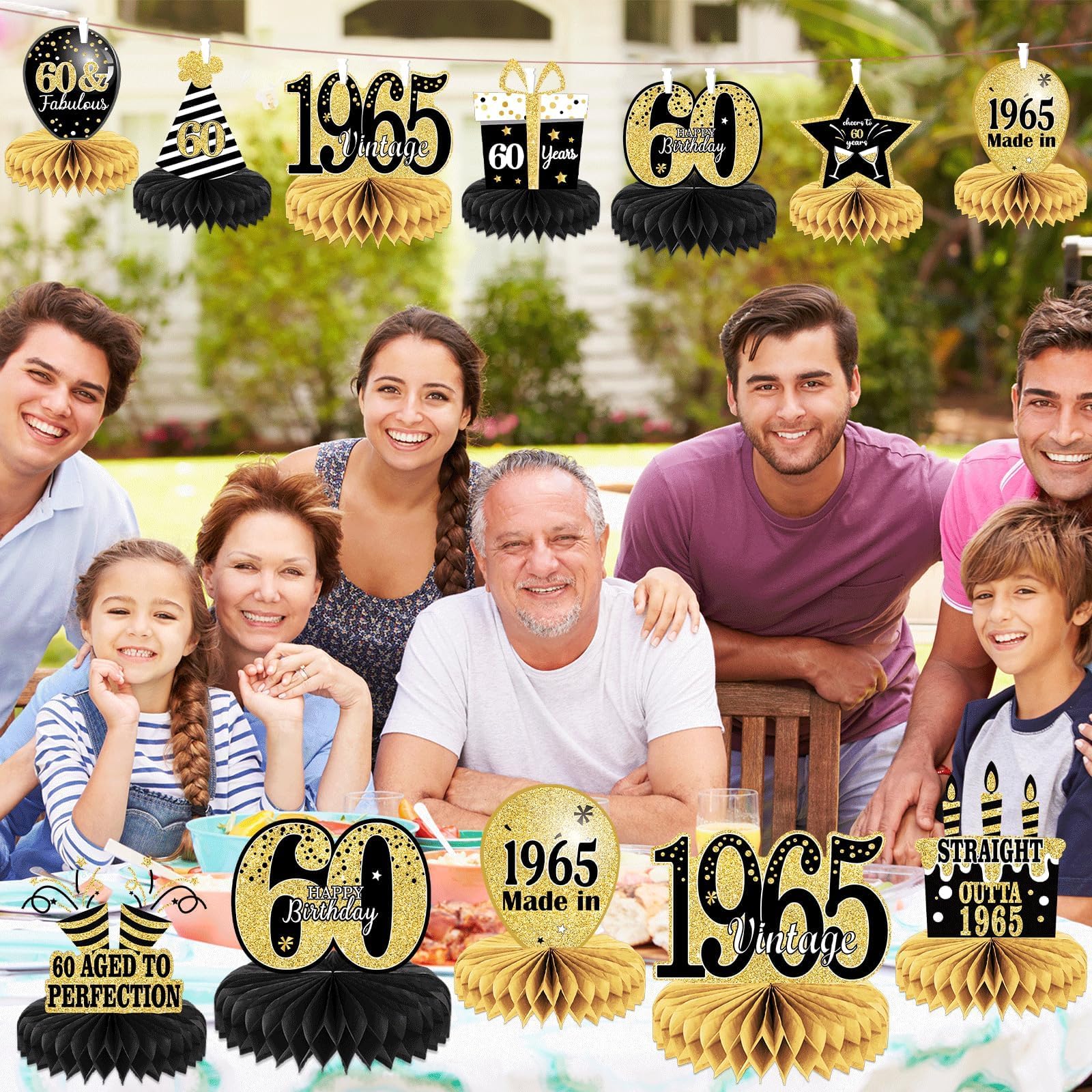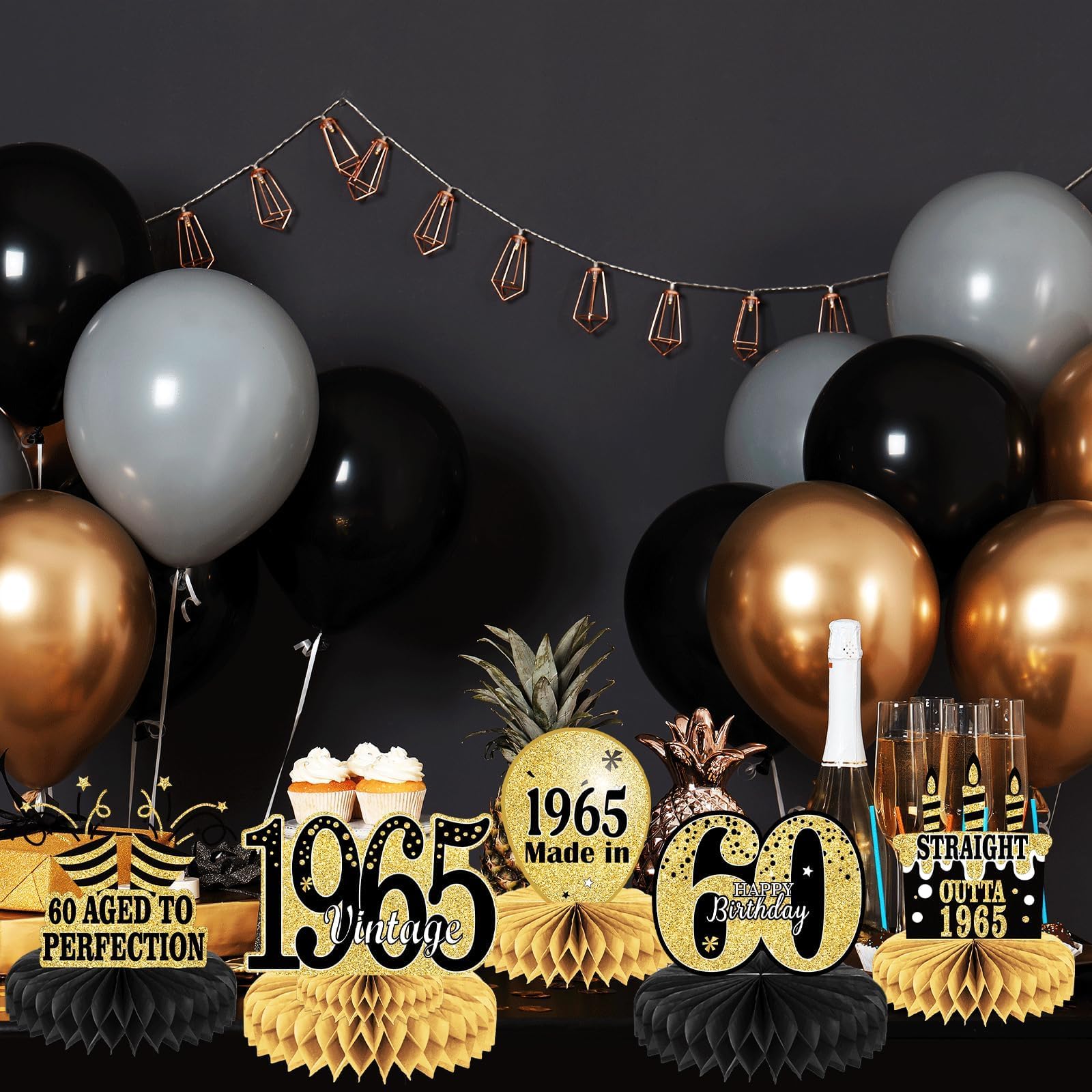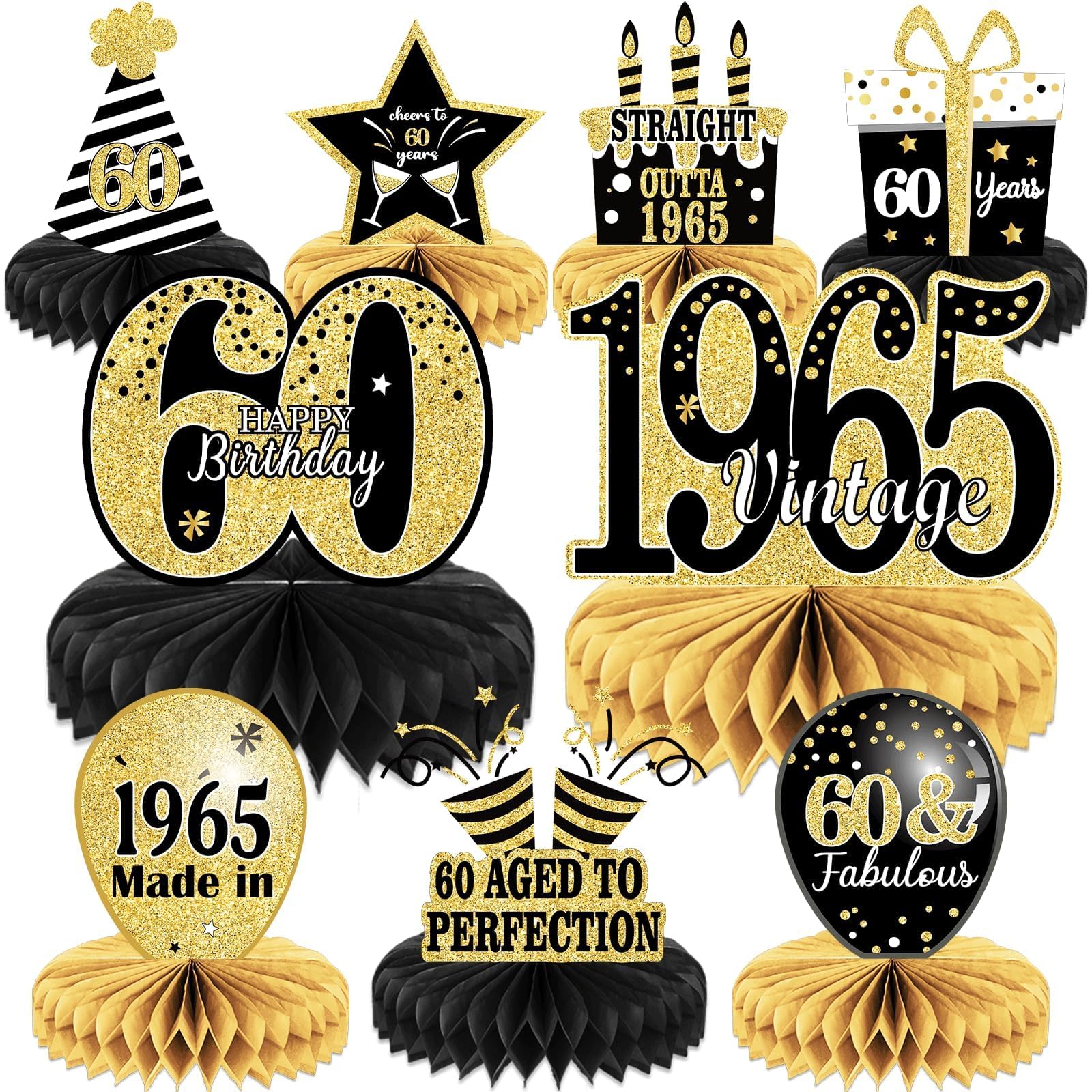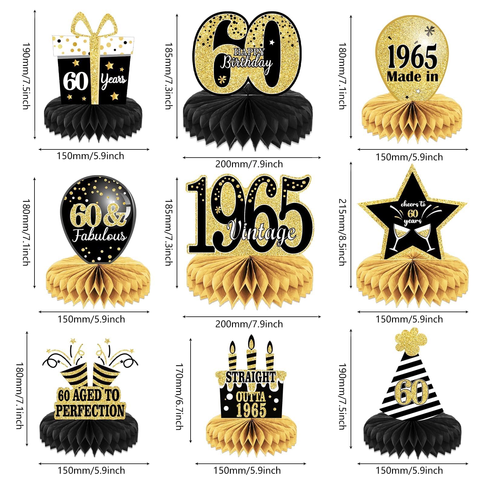 Package: you will get 9 pieces of Vintage 1965 honeycomb centerpieces including stars,cake,balloons , and so on;These 60th table decorations are so chic and funny that make your birthday theme party a big hit.
