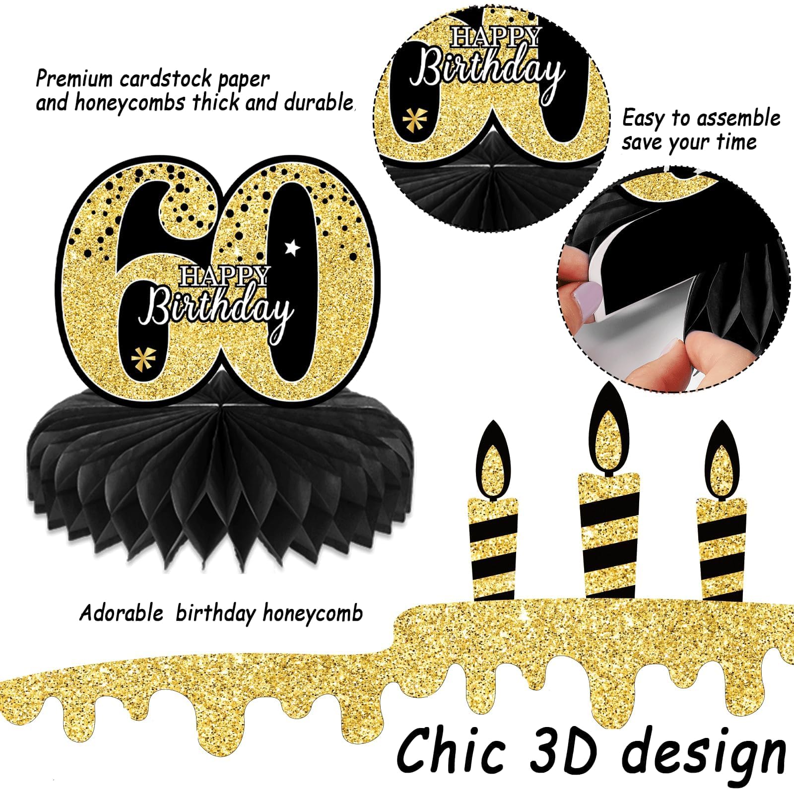 Great 60th birthday party supplies: these cheers to 60 years table centerpieces exquisitely designed with interesting birthday elements so that everyone will love these chic designs. Decorating your home and party with our honeycomb centerpieces will be a big hit at your party.
