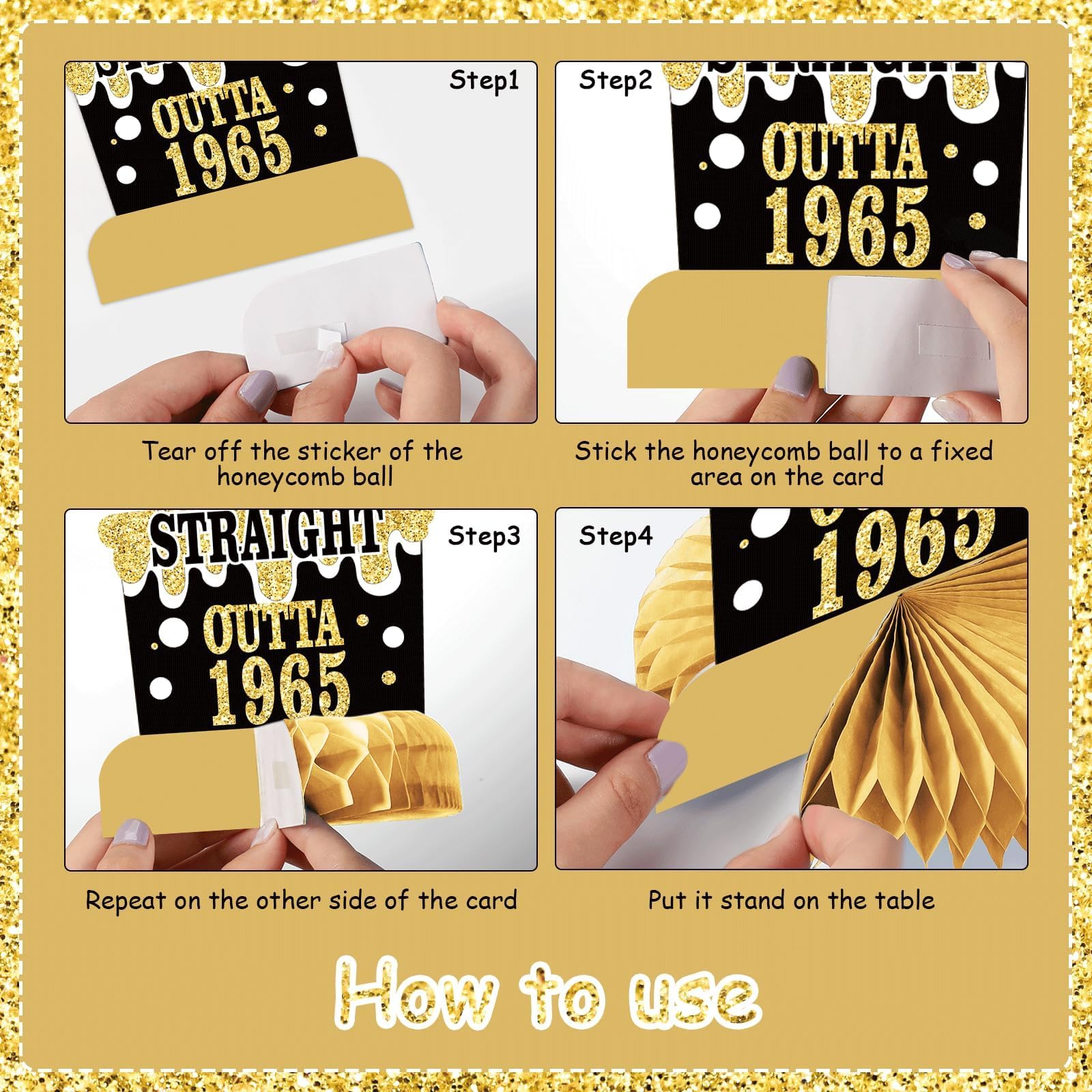How to use: Step1, tear off the sticker of the honeycomb ball. Step 2, stick the honeycomb ball to a fixed area on the card. Step 3, repeat on the other side of the card. Step 4,finally put it stand on the table. It's so easy that you can save a lot of time .