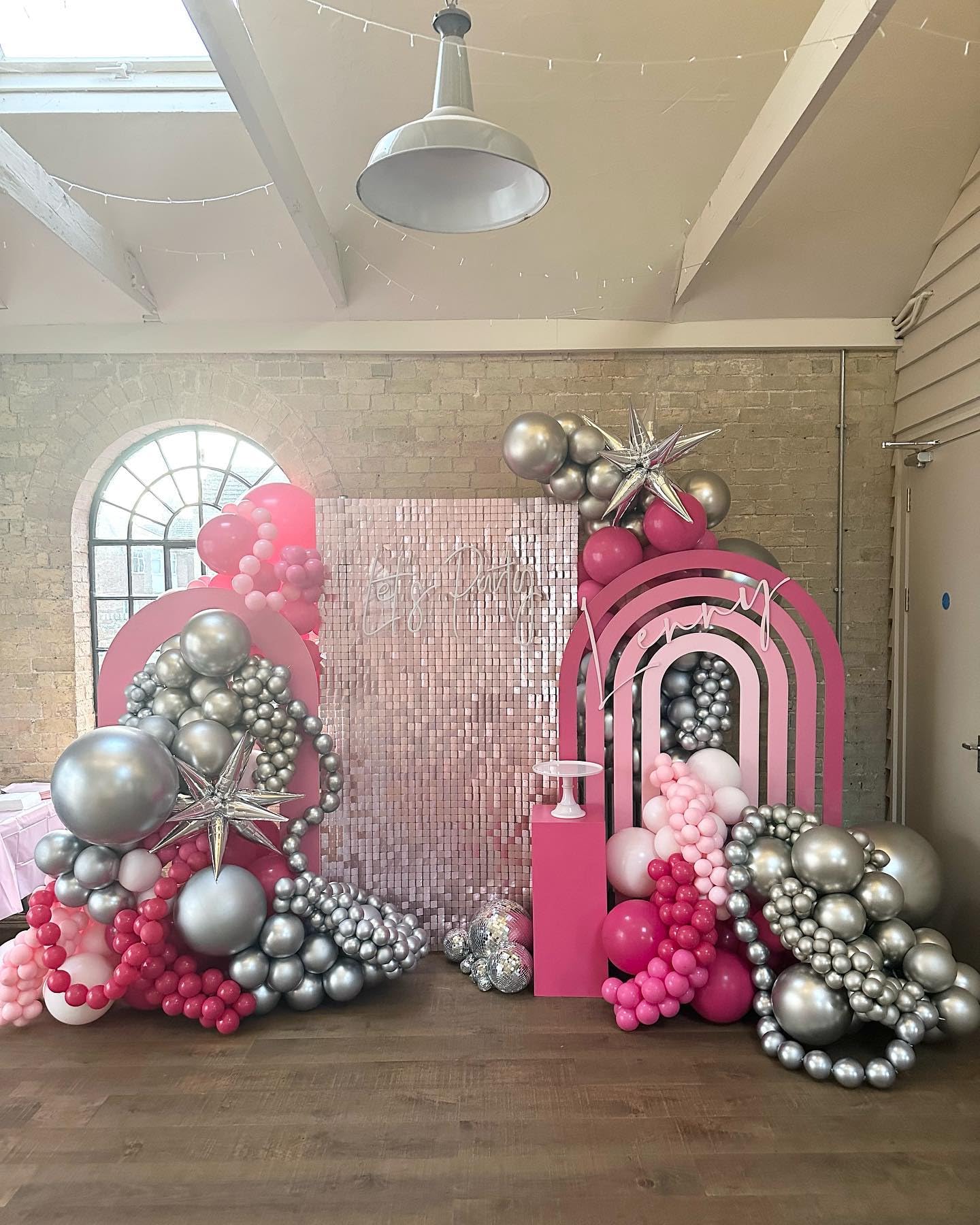 12 Inch pink and silver balloons: Package content includes 10 pcs hot pink balloons, 5 pcs light pink balloons, 10 pcs silver balloons,5 pcs pastel pink balloons, a balloon ribbon