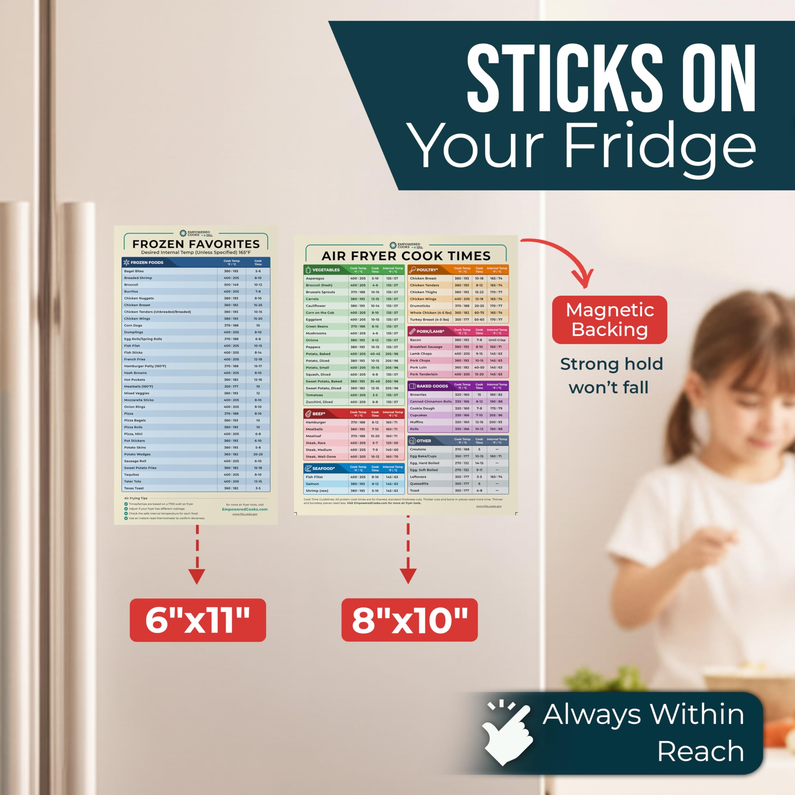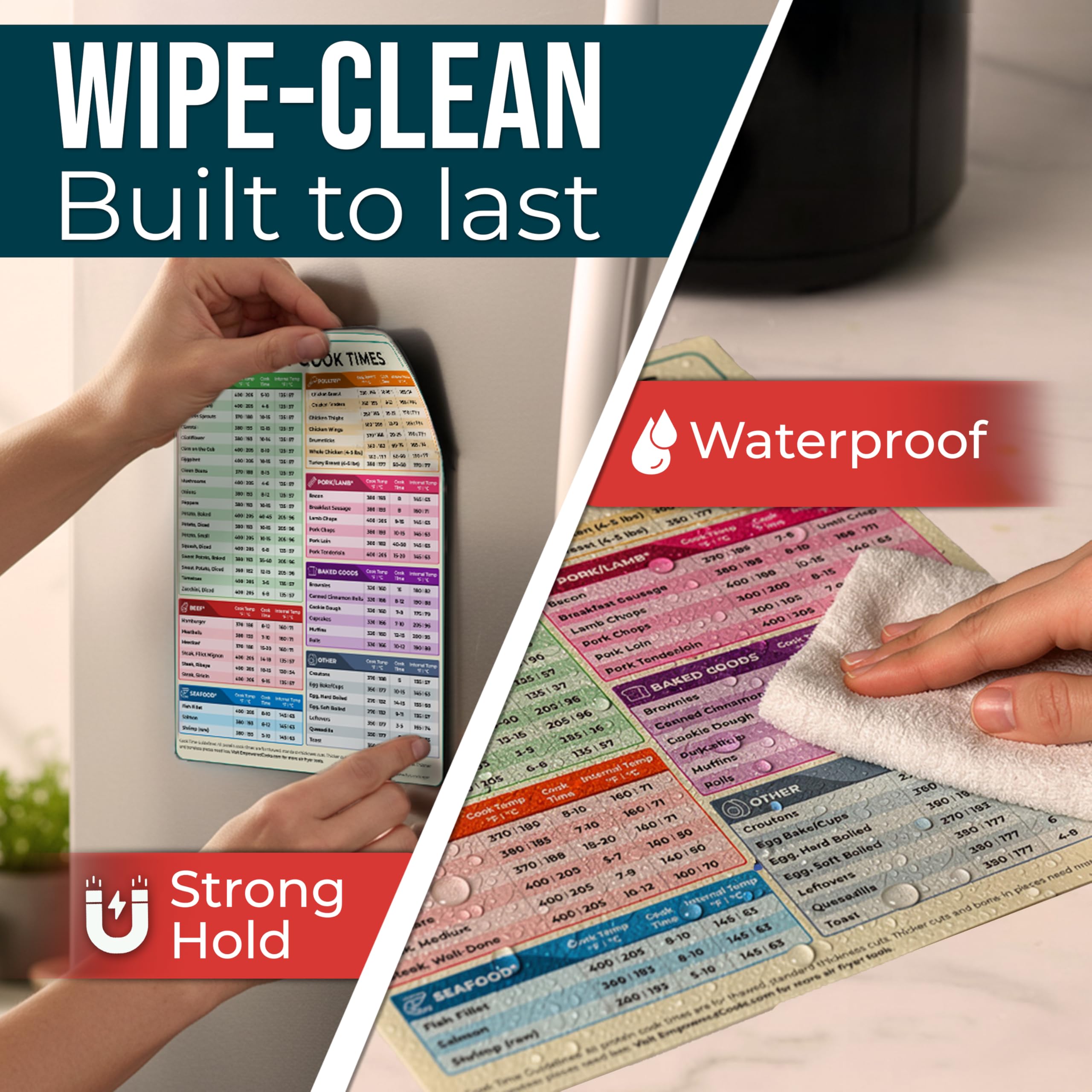 Convenient Magnetic Cheat Sheet: This air fryer cheat sheet magnet cooking guide booklet attaches securely to your fridge or other metal surfaces, providing fast access to essential cooking details. It’s a great air fryer cheat sheet that ensures you never miss key temperatures and times while cooking your favorite dishes.