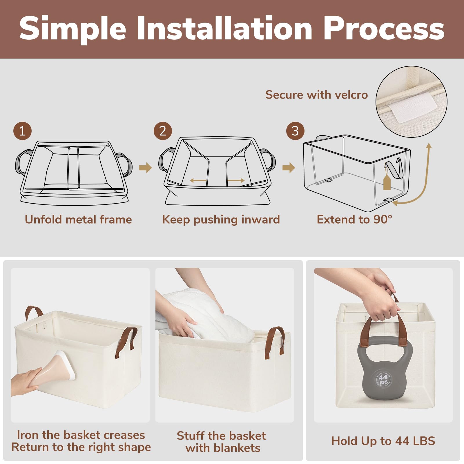 Premium Quality: Our shelf baskets boast a waterproof interior coating and are made with top-quality materials. The addition of base plates and metal frames provide superior load-bearing and upright stability for maintaining form and structure even when empty or stored