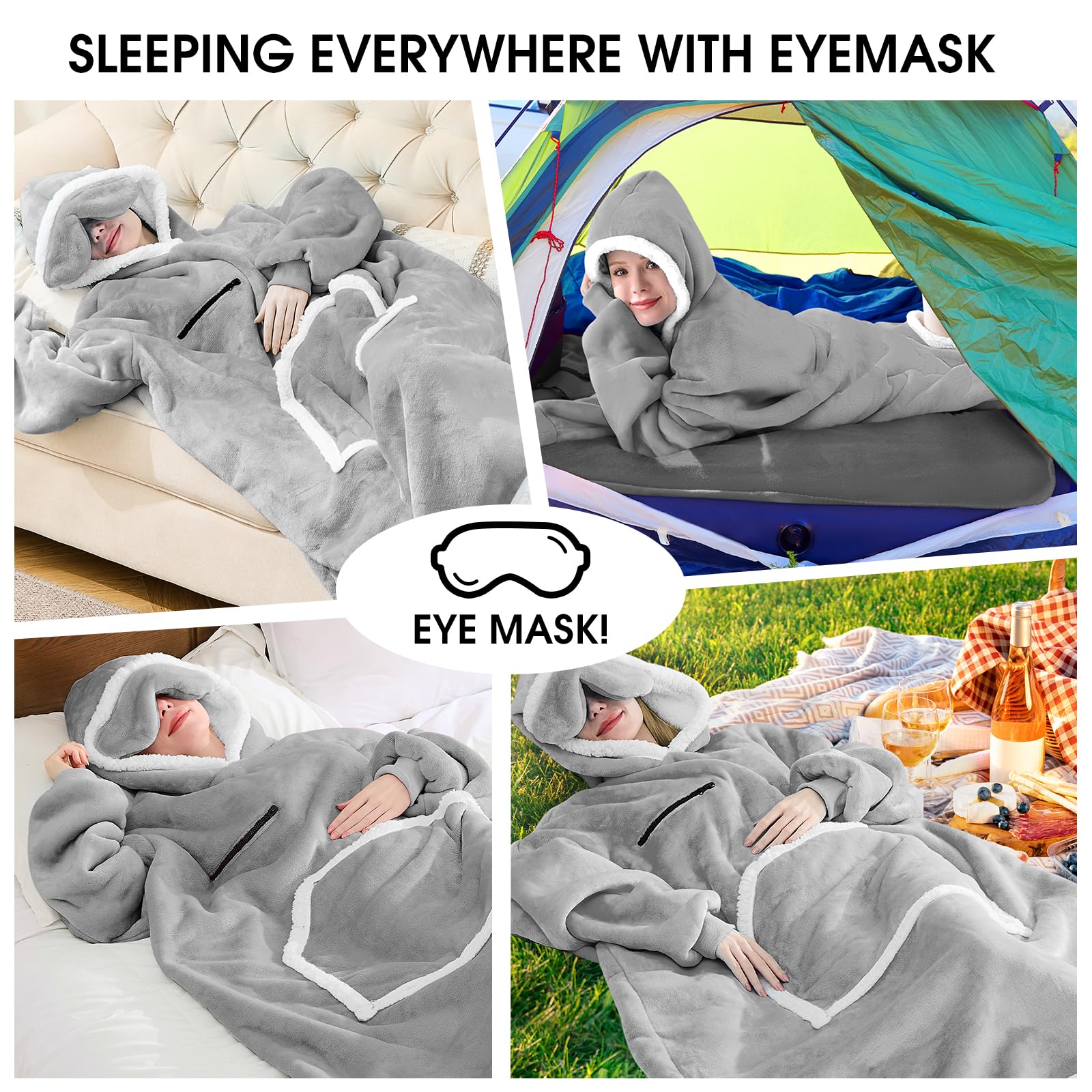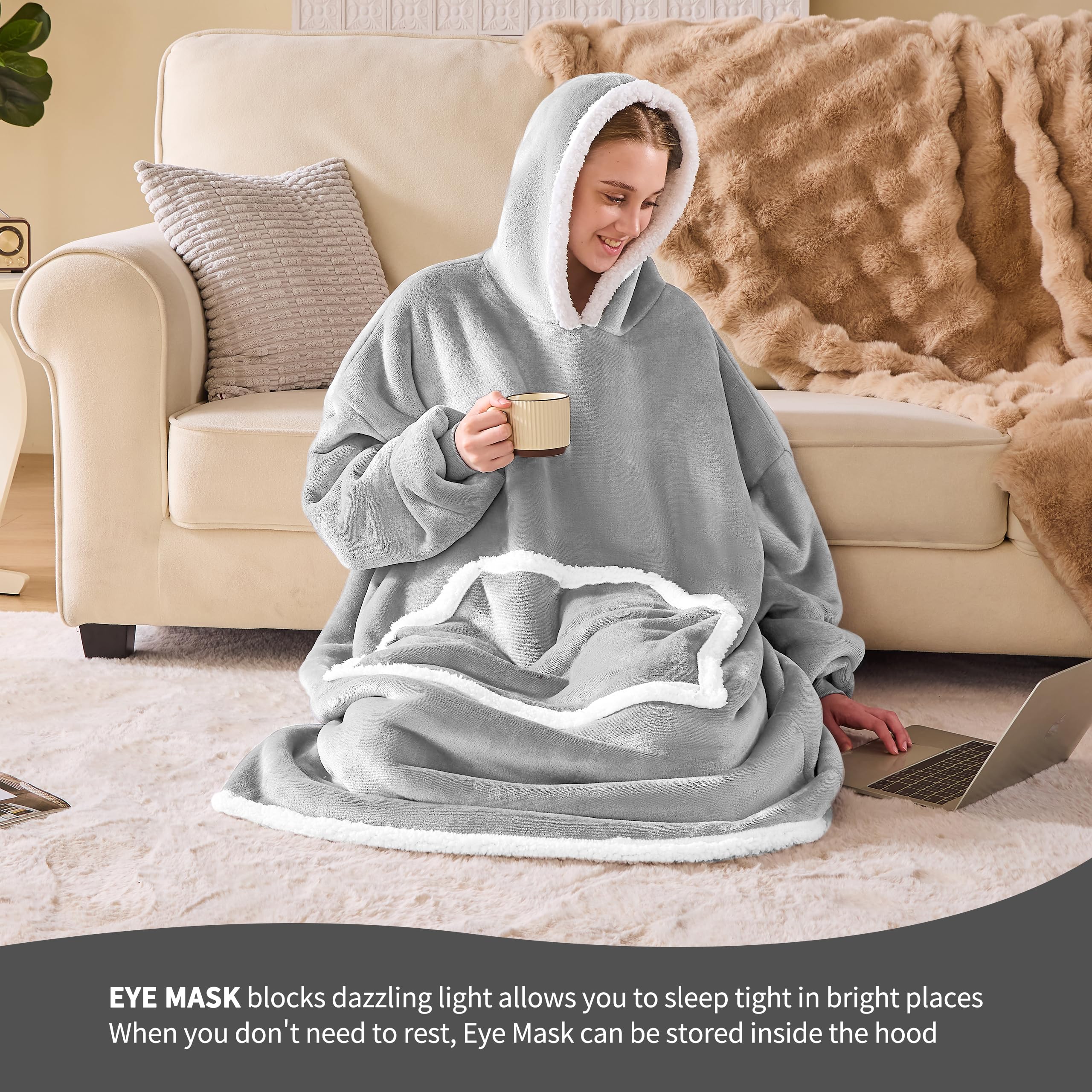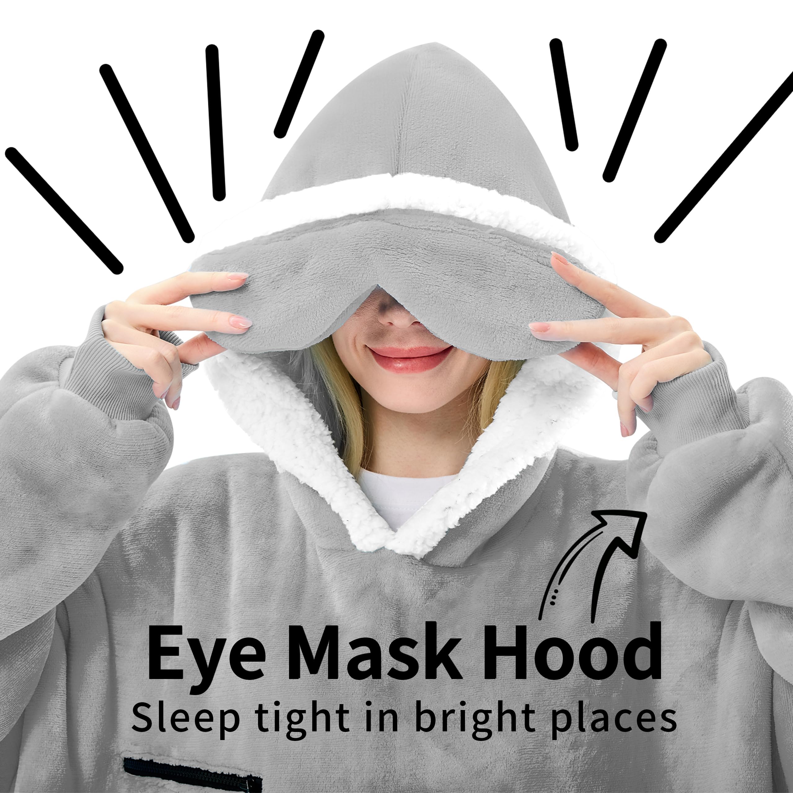 UNIQUE EYE MASK DESIGN: The Eye Mask design of this oversized blanket hoodie allows you to easily rest in many bright environments and occasions, such as in a room with the curtains drawn during the day, in front of a TV playing a program, on an airplane or in a car during your travel, fell asleep while watching a movie on your bed. You can cover your eyes with this eye mask and sleep anywhere at any time when you feel sleepy