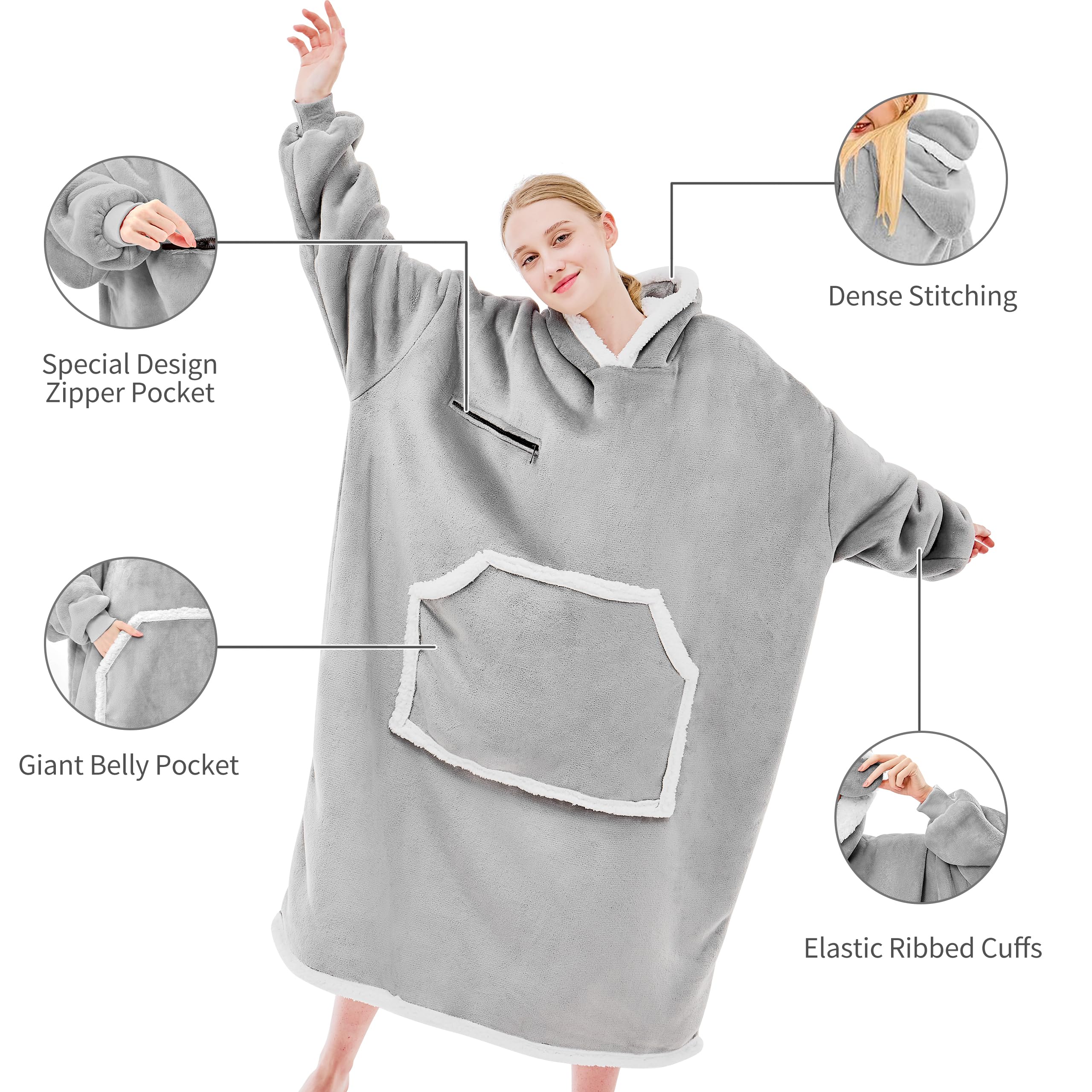 GIANT POCKET DESIGN: The pocket design allows you to conveniently hold many everything like electronic devices, books, notebooks, snacks, remote and other things you need. The pockets are large enough to slip your hands inside for warmth, and can also be used as a pet pocket to give your pet a warm hug, you and your pet will love this oversized blanket hoodie