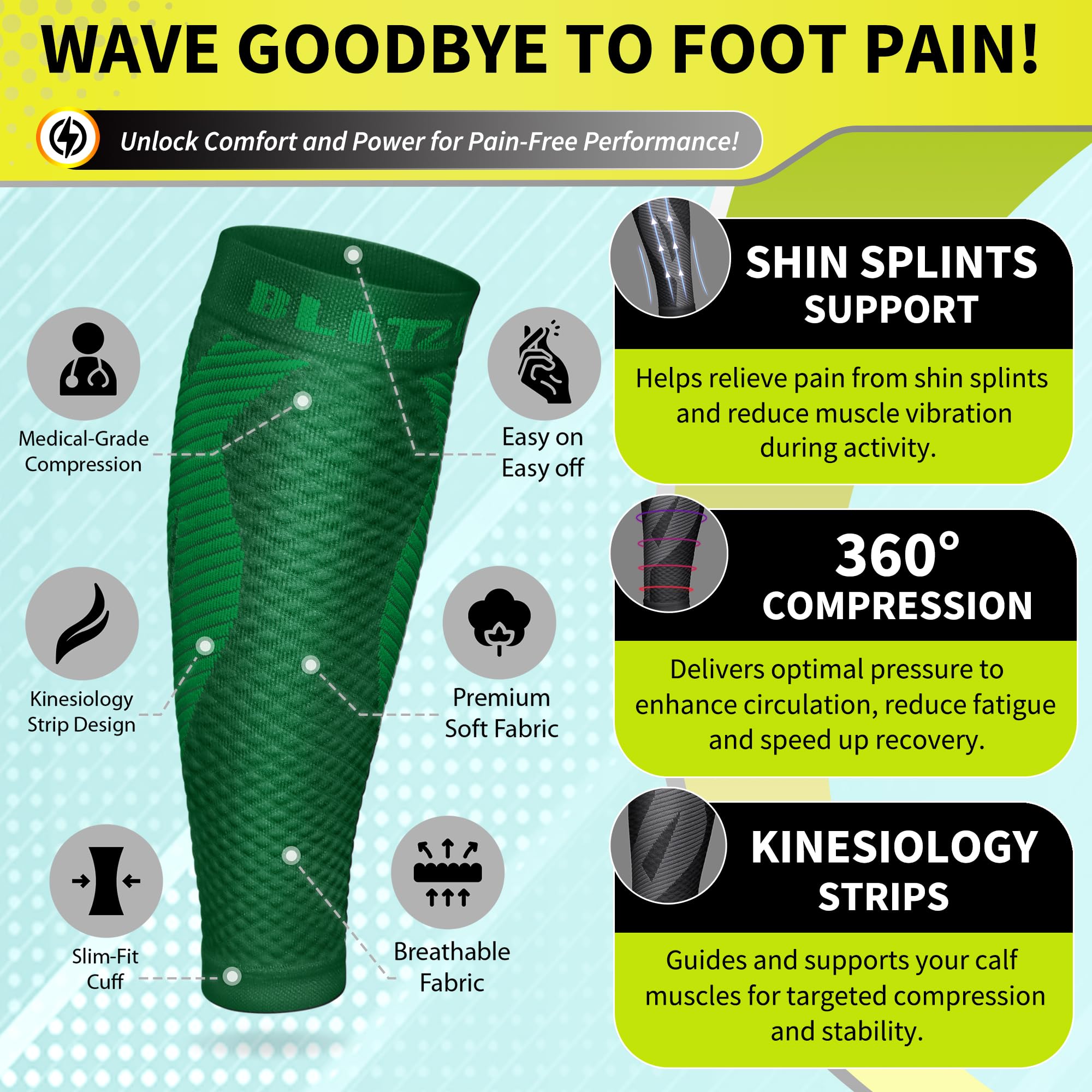 Patented Kinesiology Strips for Targeted Pain Relief: Developed and patented in New York, our calf compression sleeves incorporate advanced kinesiology strips that provide superior support, stability, and pain reduction. Designed using the renowned kinesiology technique, these strips promote natural pain relief and accelerate recovery by improving muscle function and reducing fatigue.