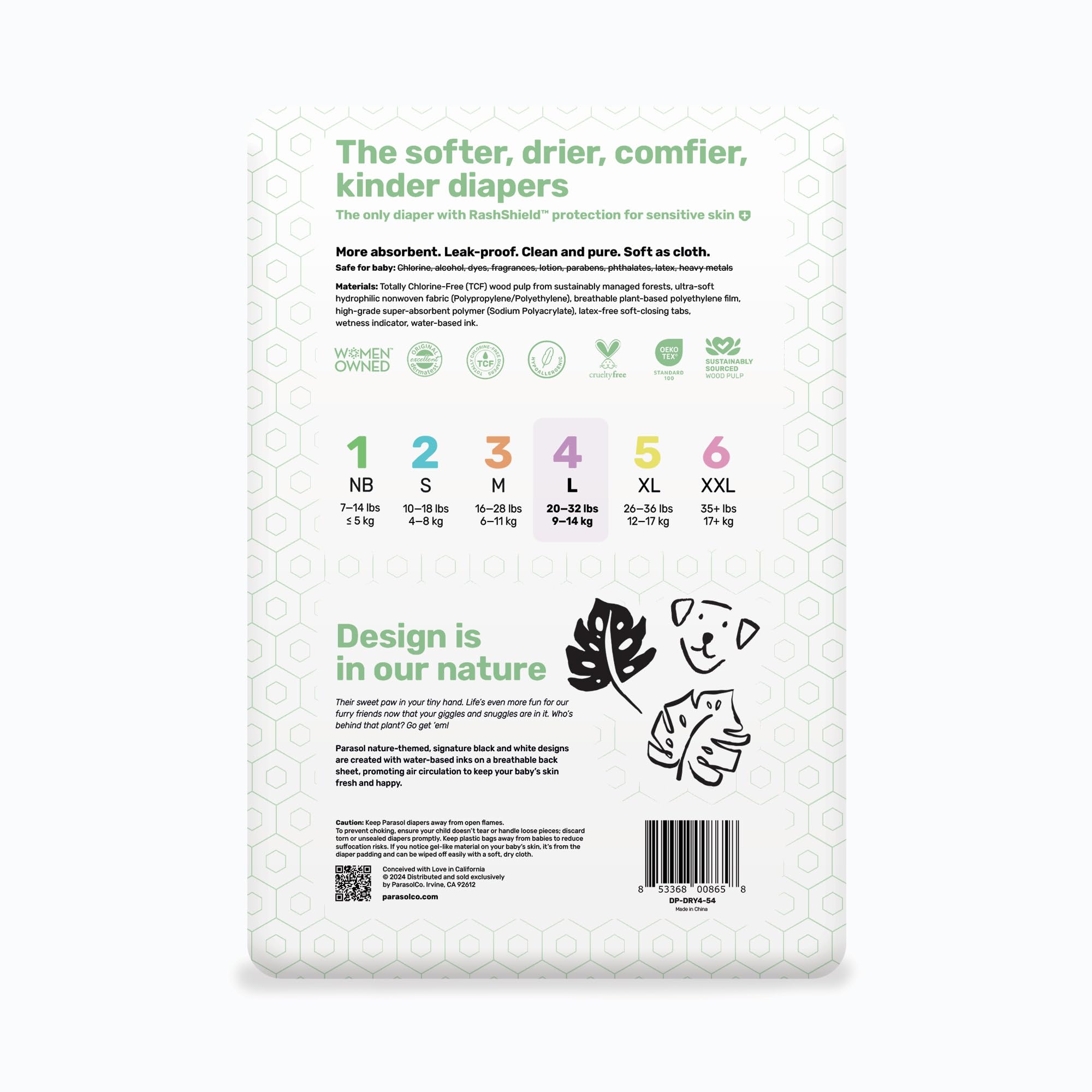 Keep baby's skin clear and dry with the first and only diapers with RashShield protection for sensitive skin. Super absorbent, soft, and lightweight fabric instantly wicks moisture and humidity away from skin to prevent irritating rashes. Breathable fabrics keep baby feeling fresh and airy, day and night. High waistband with soft 8-strand stretch contours to all body types for a comfy but secure, leak-control fit that moves with baby without pinching or leaving red marks. Non-toxic diapers are 100% chlorine free and free from alcohol, dyes, chemicals, fragrances, lotion, parabens, phthalates, latex, heavy metals and more. Enjoy premium care without the luxury price. Parasol’s got you covered.