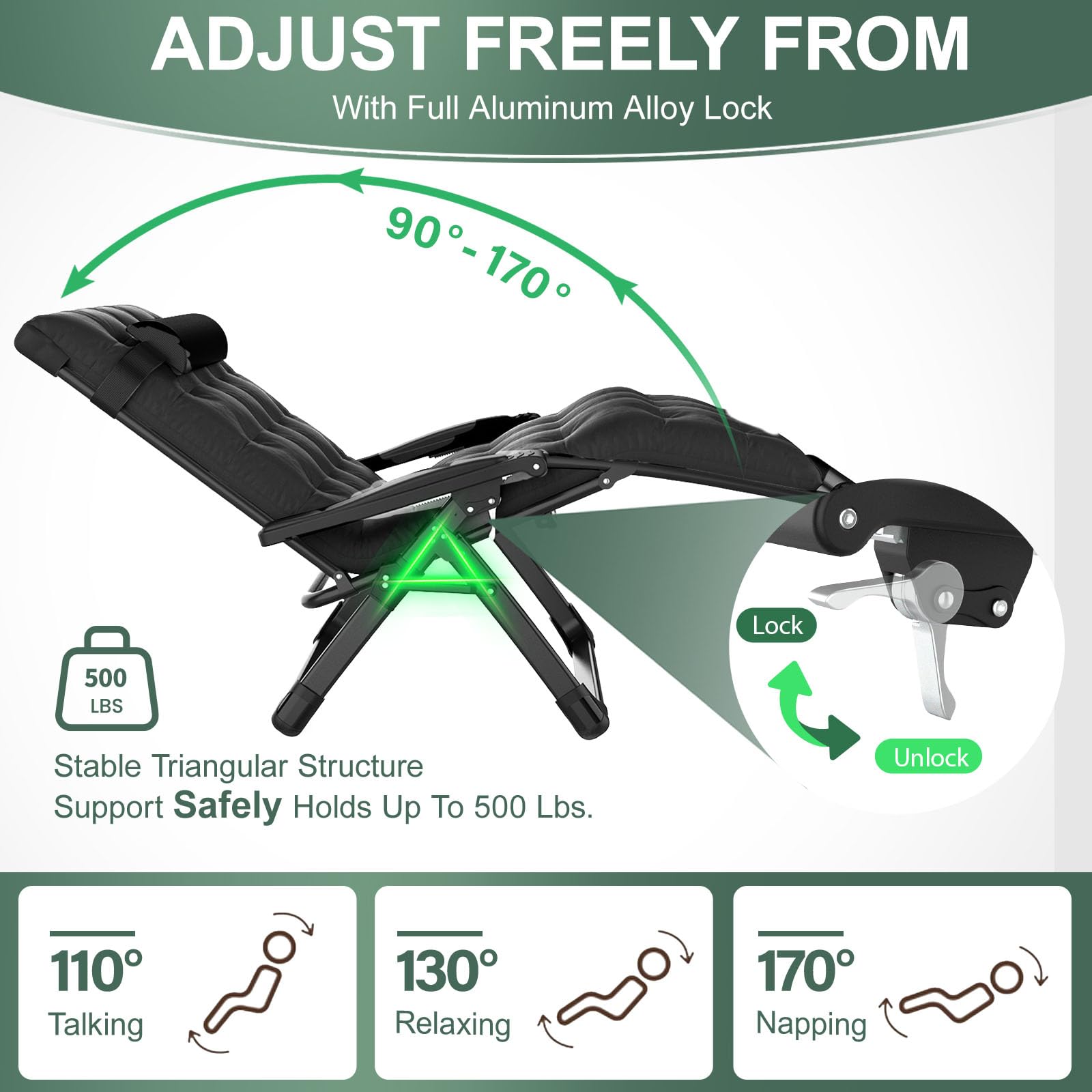 No Assembly Needed, Instant Relaxation: Ready to use right out of the box—no setup required. The upgraded aluminum lock system smoothly adjusts from 0° to 170°, letting you easily find your perfect zero gravity angle for full-body relaxation.