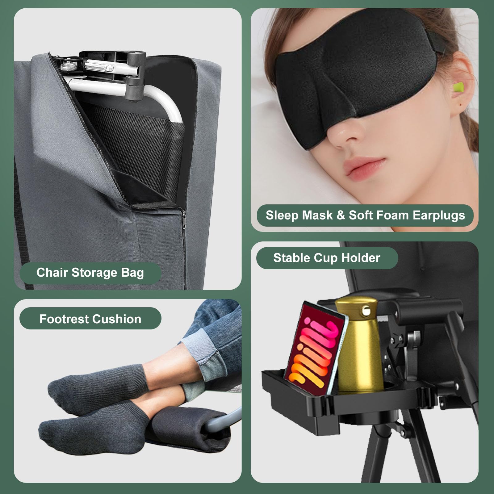 Full Comfort Kit, Thoughtfully Included: Includes a 1.8kg, 4-inch thick padded cushion, removable footrest, enlarged stable cup holder, heavy-duty storage bag, soft eye mask, and earplugs—everything you need for a truly relaxing experience, whether at home or outdoors.
