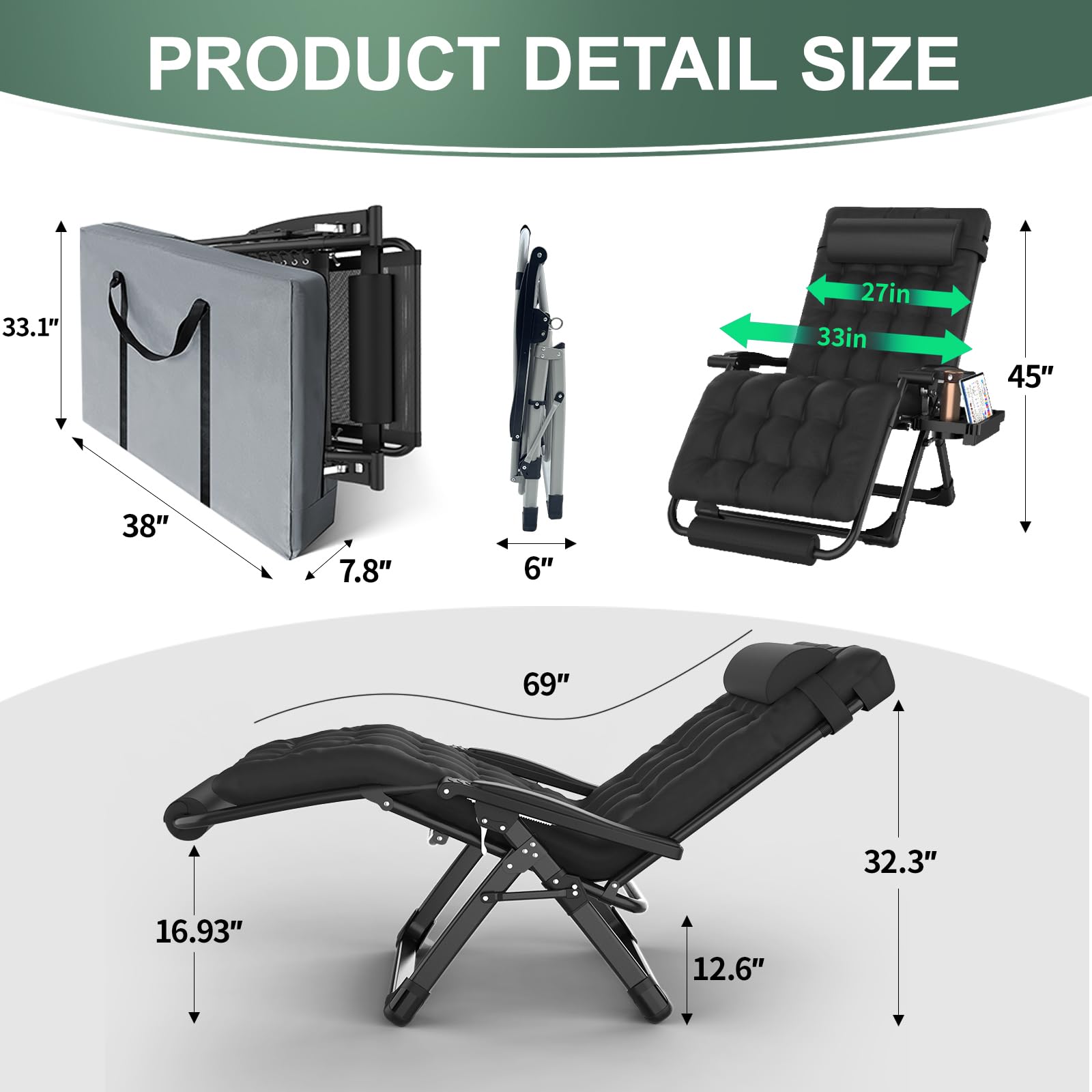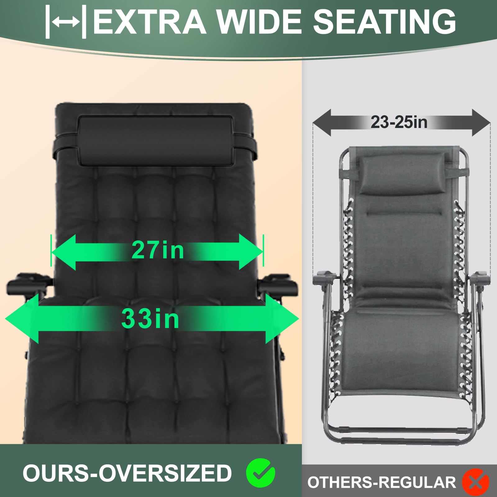 Spacious XXL Design with Upgraded Stability: This 33-inch wide XXL zero gravity chair supports up to 500 lbs, ideal for big and tall users (Inner Seat Width: 27.2"). Constructed with thickened 1.6" (40mm) steel tubes, a reinforced anti-tip triangular frame, and a widened, deepened full-aluminum lock, it provides exceptional strength, stability, and durability.