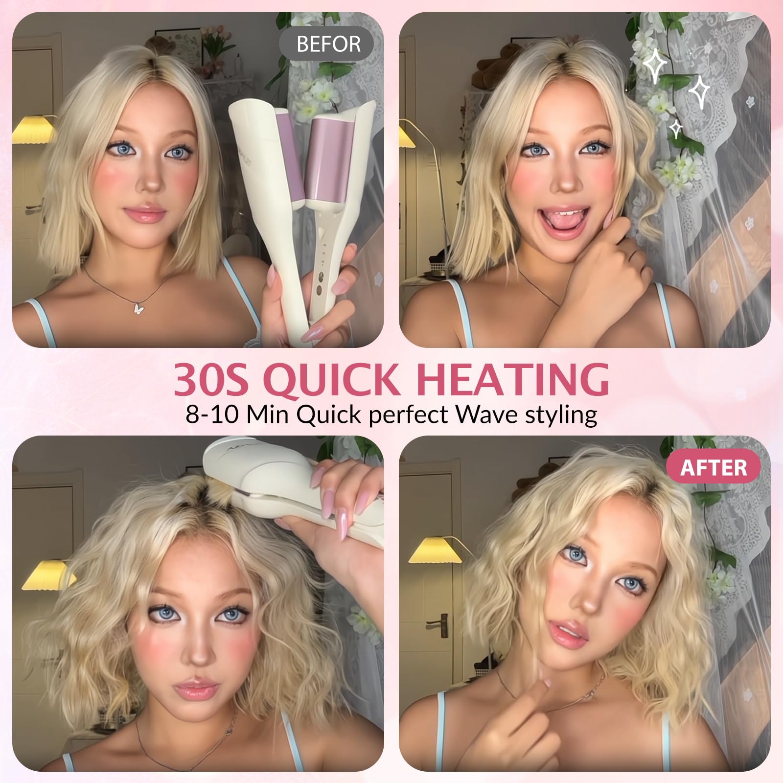 VOLUMINOUS ALL DAY: hair waver barrel increase in size to 1.42 inch/36mm, V-Curve Design delivers bigger and more luxuriant waves, Suitable for water ripples, mermaid waves, no matter how thick or thin the hair is, it is easy to create glamorous waves.while the incorporation of advanced dual-sided heating technology ensures waves that retain their shape and stay strong for an extended period