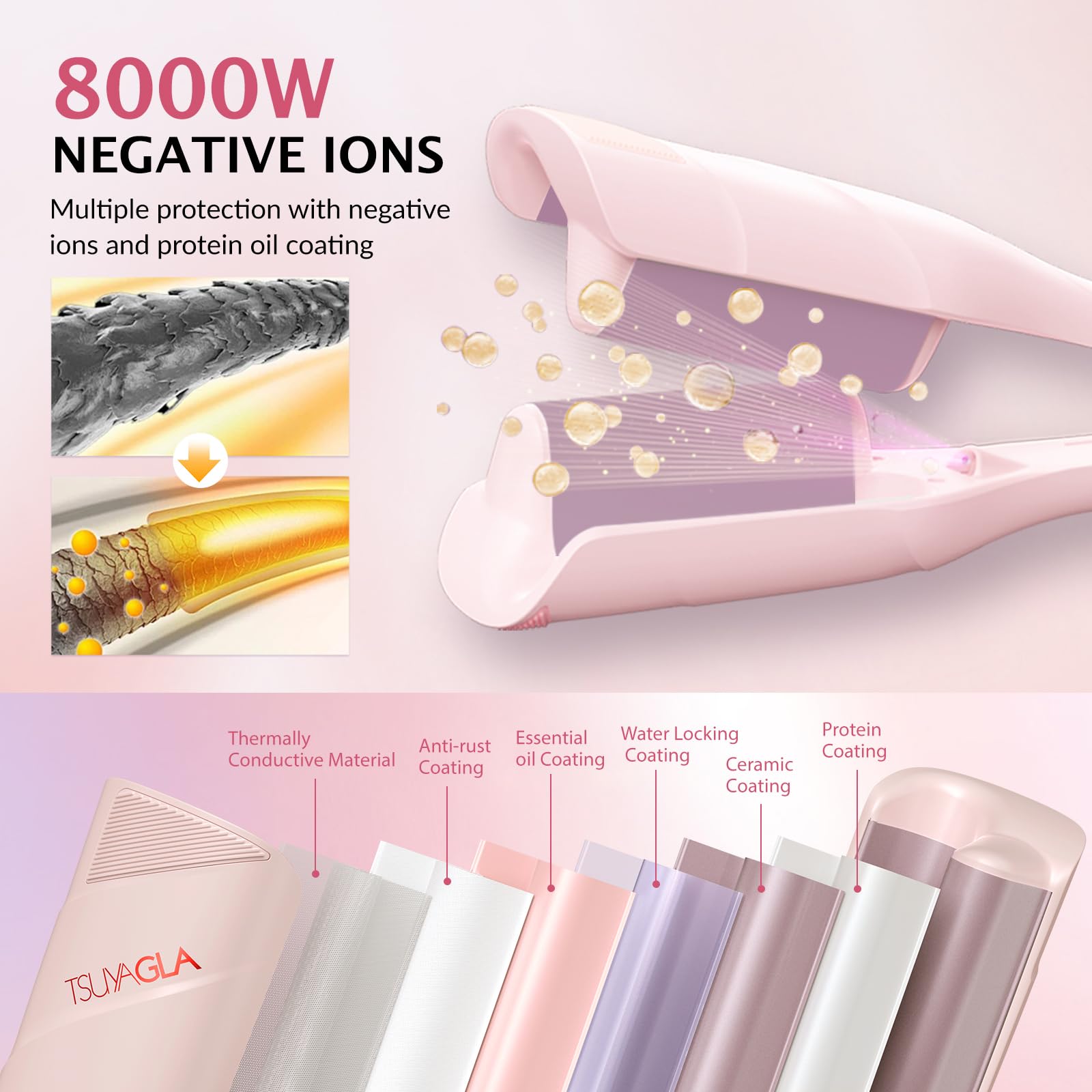 DAMAGE-FREE WAVY HAIR : TSUYAGLA hair crimper contain 80 million negative ions, Smooths away frizz and adds smoothness and shine during use. Waver Curling Iron helps to neutralize static electricity, leaving waves silky and free from Voluptuous hair, while a multi-layer ceramic coating with nourishing extracts ensures that every strand is cared for and healthy