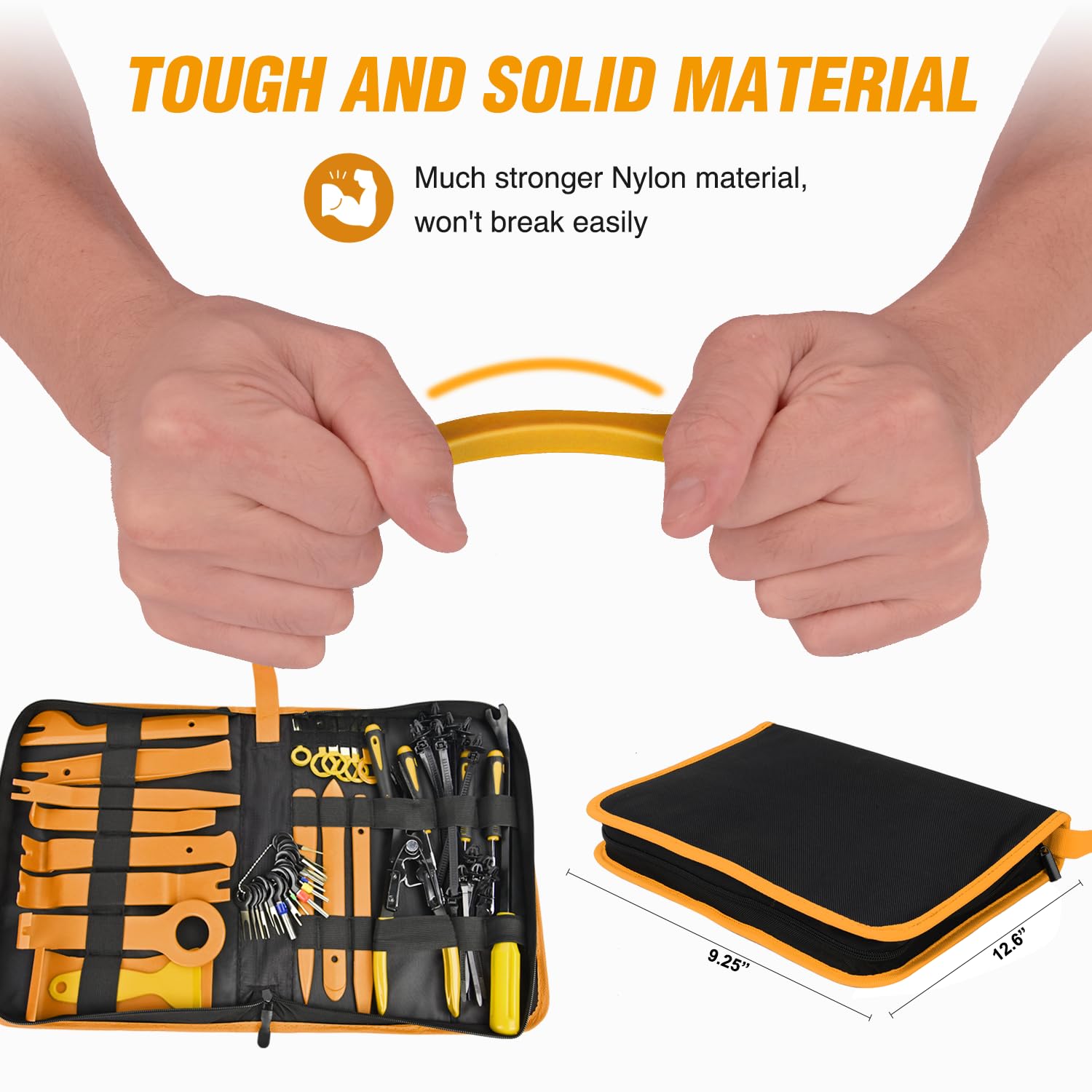 【Package Include】- 238Pcs Trim Removal Tool, includes 120 x Car Retainer Clips, 20 x Adhesive Cable Clips, 20 x Plastic Cable Ties, 30 x Sponge Cushion, 11 x Trim Removal Tools, 1 x Trim Clip Removal Pliers, 1 x Car Foil Small Scraper Tool, 2 x Upholstery fastener remover, 4 x Precision hook pick, 11 x Stainless steel stereo removal tools, 18 x Stainless steel Auto Terminal Removal Tool and a portable bag