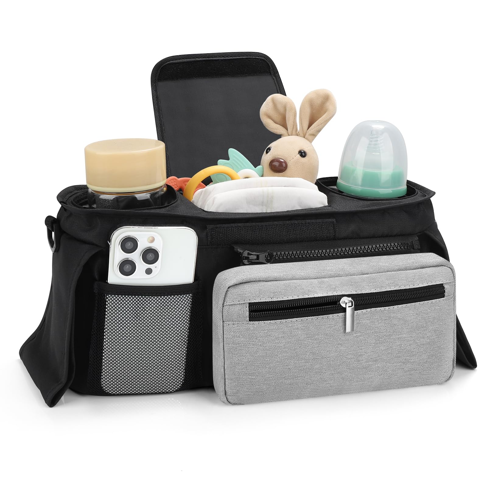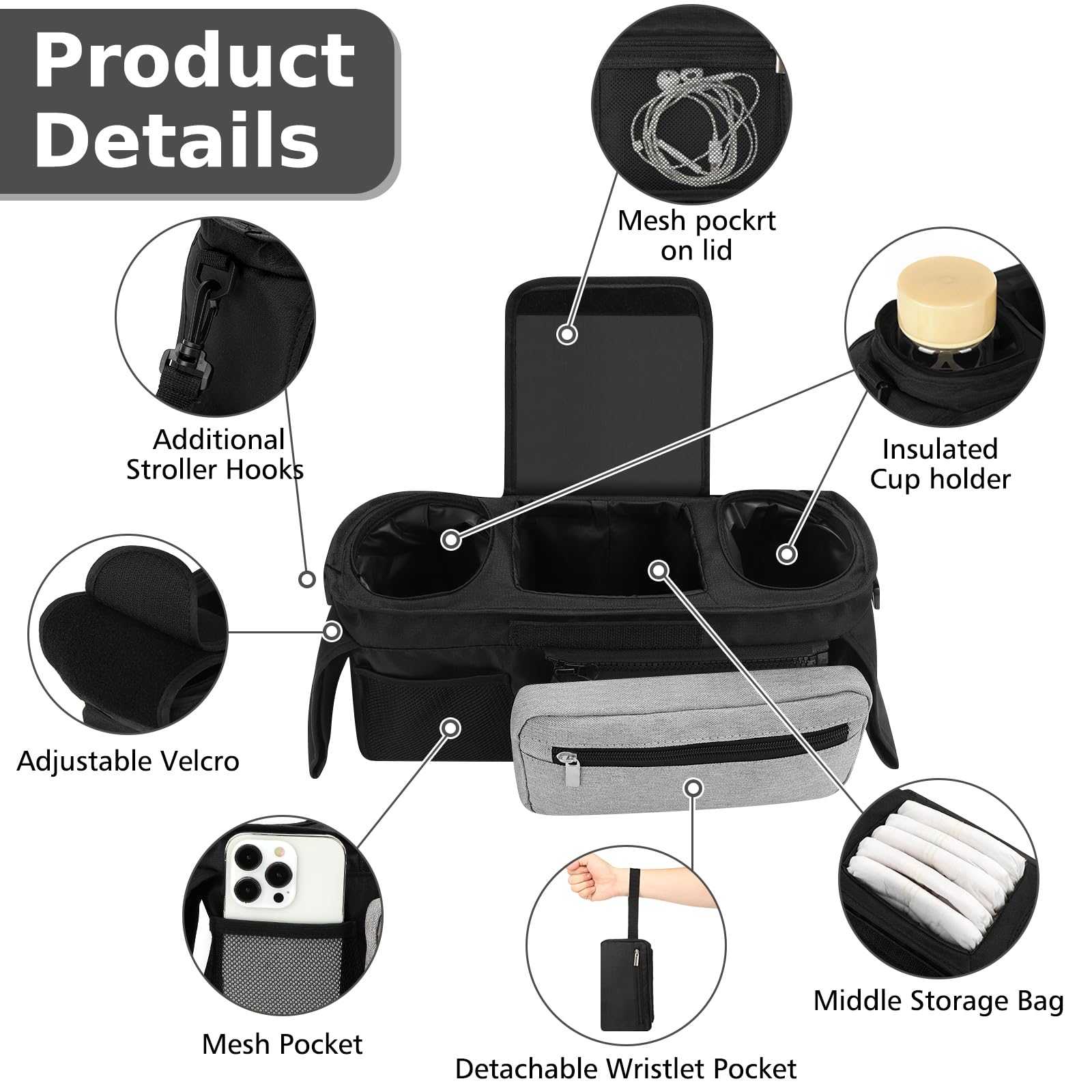Multi Structure: This stroller storage organizer equipped with multifunctional structure: Insulated cup holders on both sides to place baby bottles and drink cups; The middle storage compartment can accommodate baby diapers, wipes, pacifiers, teething toys and other accessories; Equipped with a detachable and portable small bag, it is convenient for mothers to store important items such as cell phones, wallet etc.