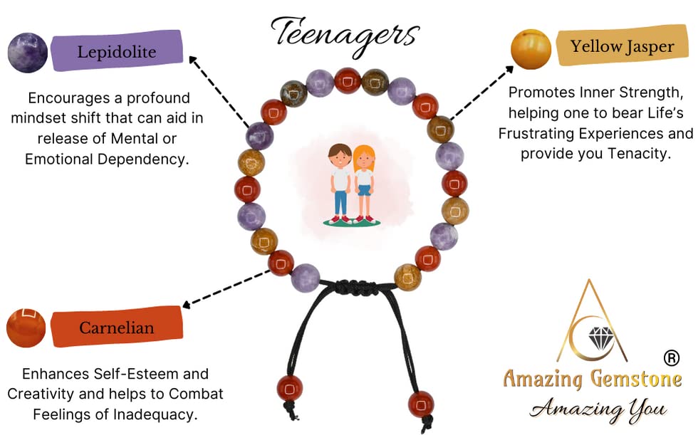 Bracelet for Teenagers contains real crystal beads Yellow Jasper, Lepidolite and Carnelian. Yellow Jasper for inner strength, Lepidolite for emotional dependency & Carnelian for self esteem Stocking Stuffers.