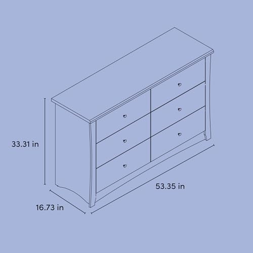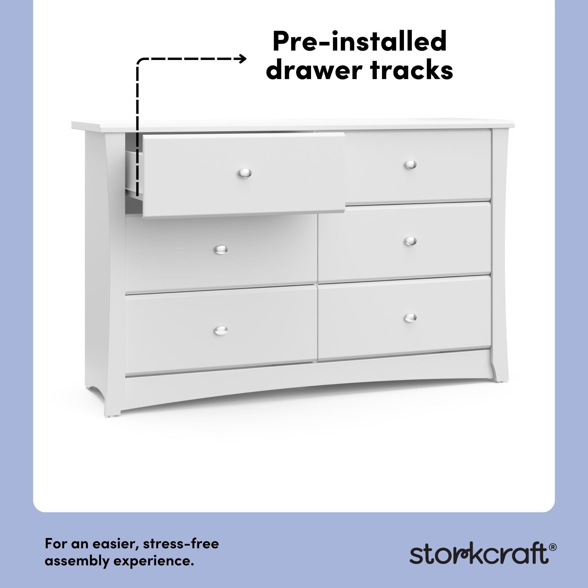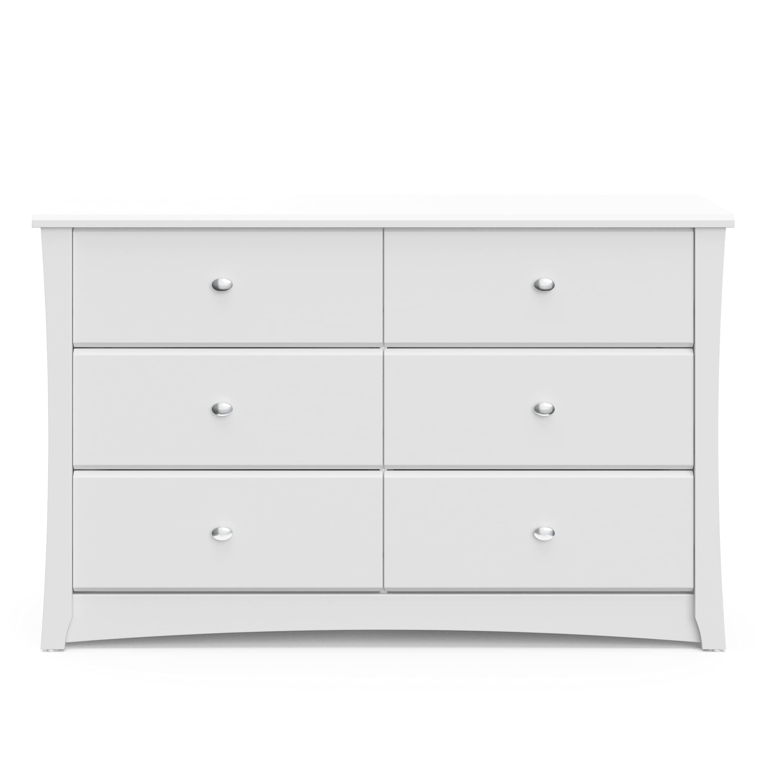 The perfect storage solution to organize your child's bedroom, the Storkcraft Crescent 6 Drawer Dresser combines impeccable style and functionality in an affordable package. Sleek lines, elegant curves and oval, metal knobs accentuate modern flare, as this versatile dresser is designed to coordinate with any home furniture and will grow with your child well into their adolescent years. Featuring six spacious drawers on euro-glide metal tracks and safety stops, this dresser can securely store all your child's clothes, toys and other belongings. Fastened with German cam locks and finished with high-quality laminate in a selection of rich colors and finishes, this dresser is durable and resistant against dirt or accidental spills. The Storkcraft Crescent 6 Drawer Dresser is stringently tested to meet or exceed all applicable federal safety standards, in addition to federal anti-tipping standards.