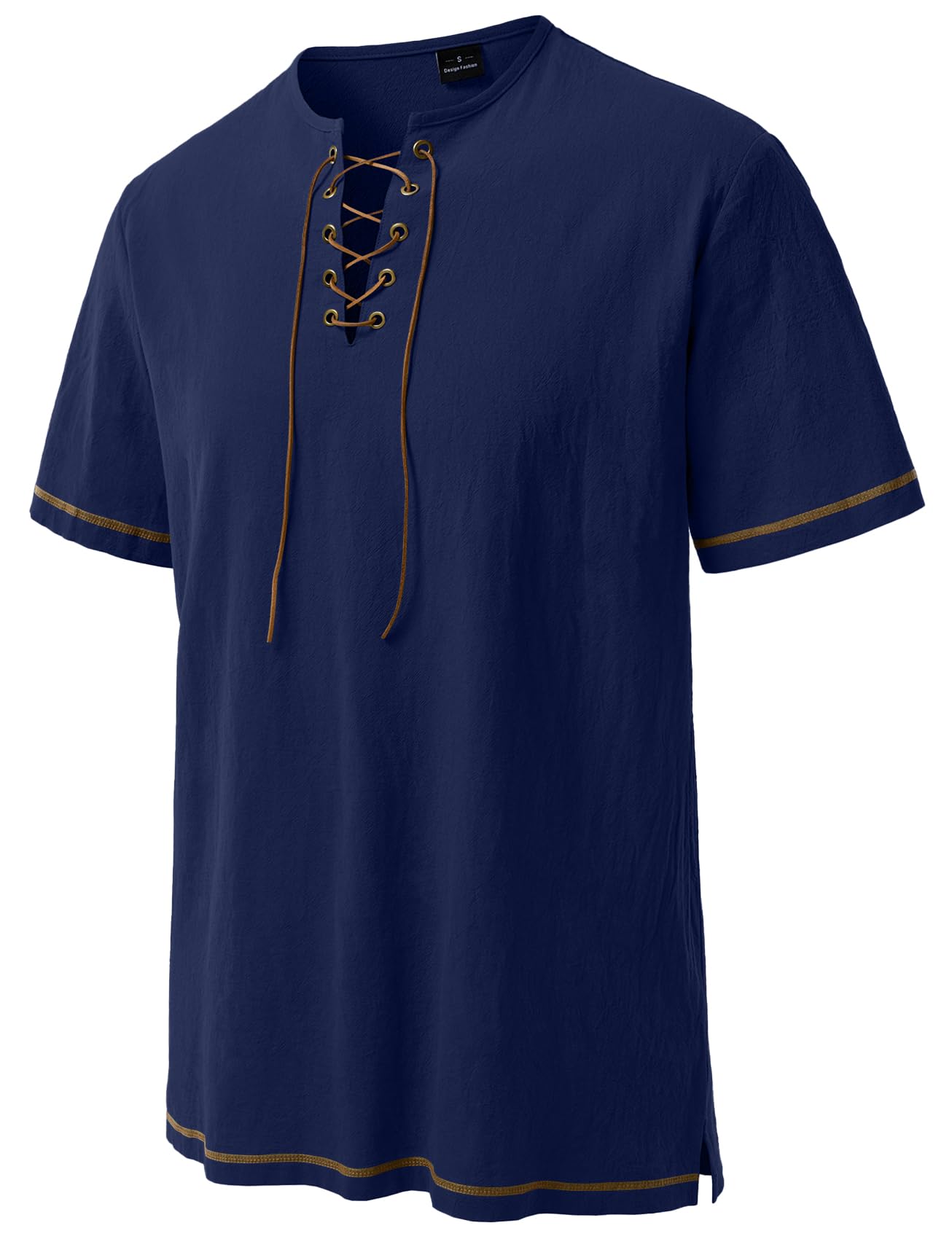 Design Concept: Mid-long tunic top / Contrast color drawstring design / Bronze buttonholes with retro buttons / Regular fit / V neck / Side slit / Short Sleeves