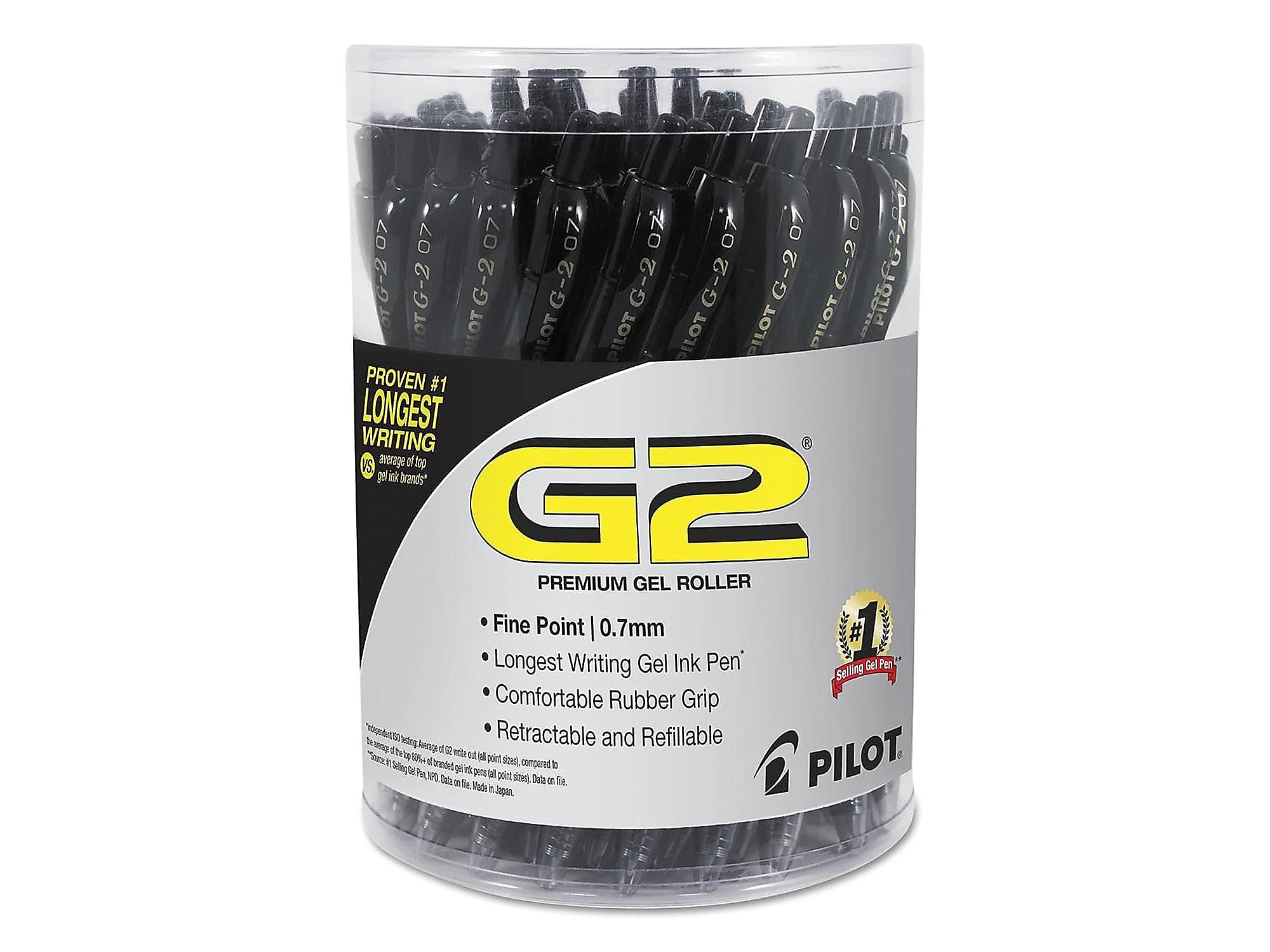 Canister showcases the Pilot G2 Premium Gel Roller, the ultimate pen for the everyday overachiever. Smooth-writing gel ink glides onto the page. G2 is proven to be the longest-writing gel ink pen vs. the average of top gel ink brands. Latex-free rubber grip provides long-lasting comfort. Fine point conveniently retracts so no stray marks on pockets or bags, and retractable tip means no cap to lose. Gel ink pens are refillable for lasting use.