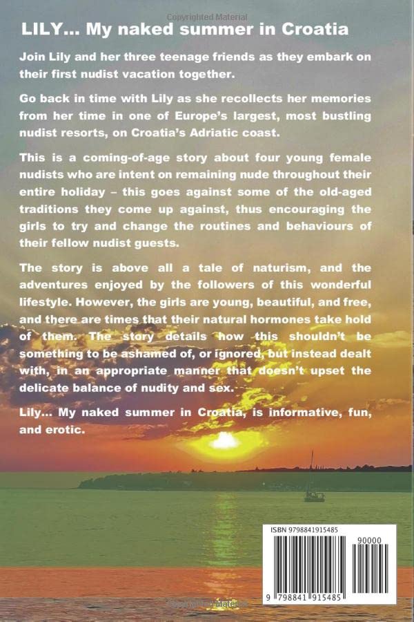 Join Lily and her three teenage friends as they embark on their first nudist vacation together. Following the excellent feedback from Lily's first book, Lily... The story of a young female nudist, this second publication goes back in time as Lily recollects her memories from her time in a large, bustling nudist resort in Croatia. Lily... My naked summer in Croatia, is a coming-of-age story about four young female nudists, who are intent on remaining nude throughout their entire holiday - this goes against some of the age old traditions they come up against, thus encouraging the girls to try and change the routines and behaviors of their fellow nudist guests. The story is above all a tale of naturism and the adventures enjoyed by the followers of this wonderful lifestyle. However, the girls are young, beautiful and free. There are times that their natural hormones take hold of them and the story details how this shouldn't be something to be ashamed of, or ignored, but instead dealt with, in an appropriate manner that doesn't upset the delicate balance of nudity and sex. Lily and her friends meet a lot of other nudists during their vacation, and make a big impact on them all with their dedication to the nudist lifestyle. Lily... My naked summer in Croatia, is informative, fun and erotic.