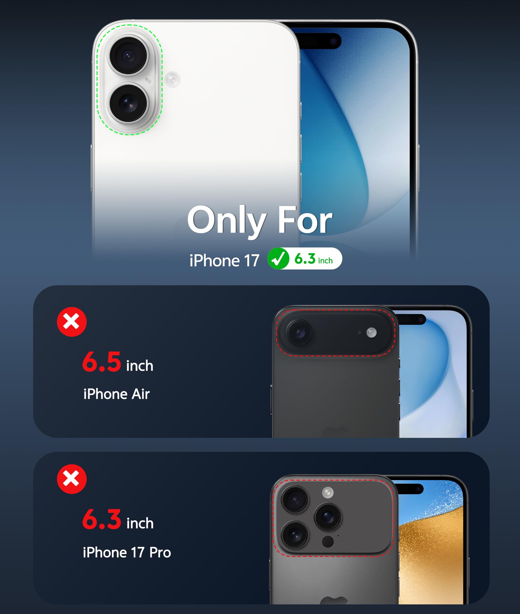 Compatibility: ONLY Fit iphone 17. Not for iphone 17 pro/iphone 17 pro max/iphone air, or any other phone models. Please confirm your model before purchase. NOTE: Before putting on our phone case (with built-in screen protector), remove the tempered glass screen protector from your phone first