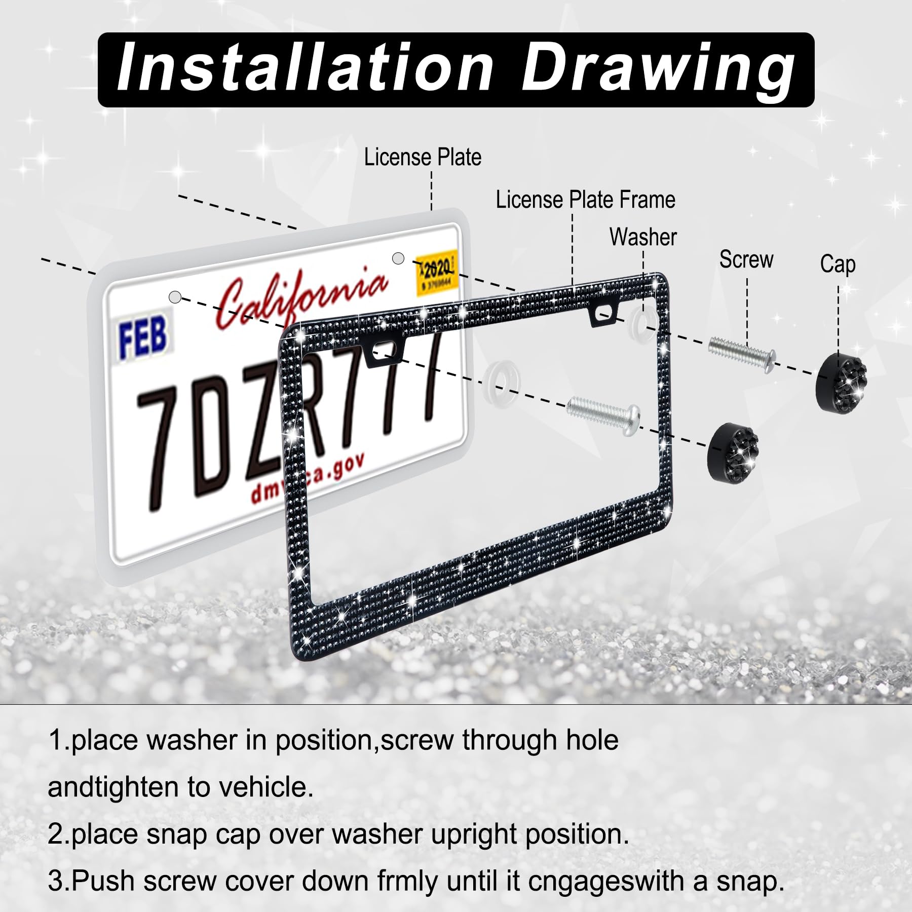 PREMIUM QUALITY: It is difficult to slip off after prolonged usage due to the stainless steel material, polygon-cut crystal rhinestones, wear-resistant, waterproof, and completely covered with exquisite handcrafted crystal. In addition, the expertly polished license plate frame won't harm your hands or your automobile.