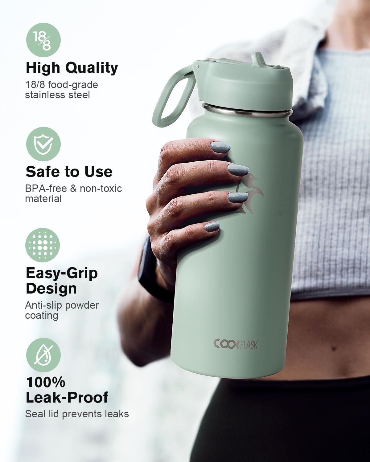 Going Green: 32 oz Insulated Water Bottle is built with 18/8 (304) stainless steel that's BPA-free, reusable, and safe for all. It's rust-proof, and free from oder retain. Liquid can be fresh in its best taste for a whole day