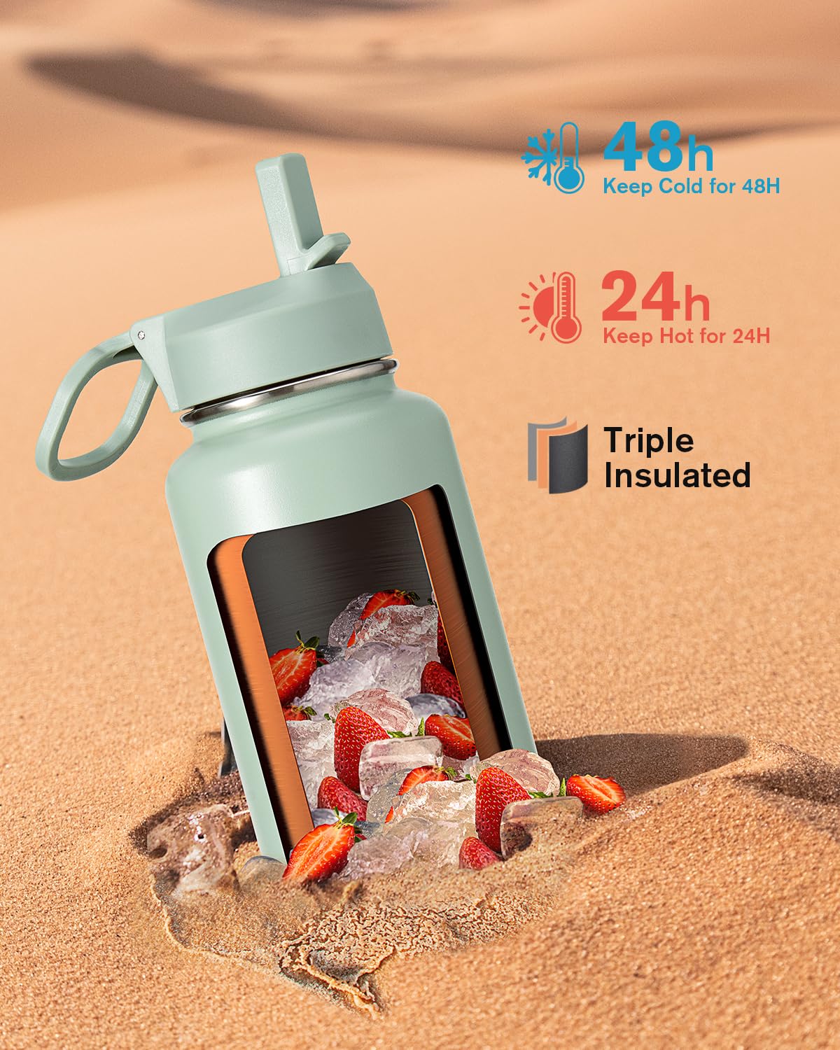 48H Cold & 24H Hot: Triple Insulation Technology adopts double wall and vacuum seal, keeps beverages cold for up to 48 hours and hot 24 hours. Anti-sweat coating can keep the surface dry and clean, making it easy to grip