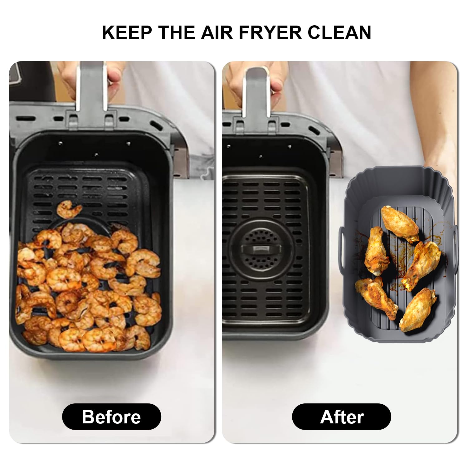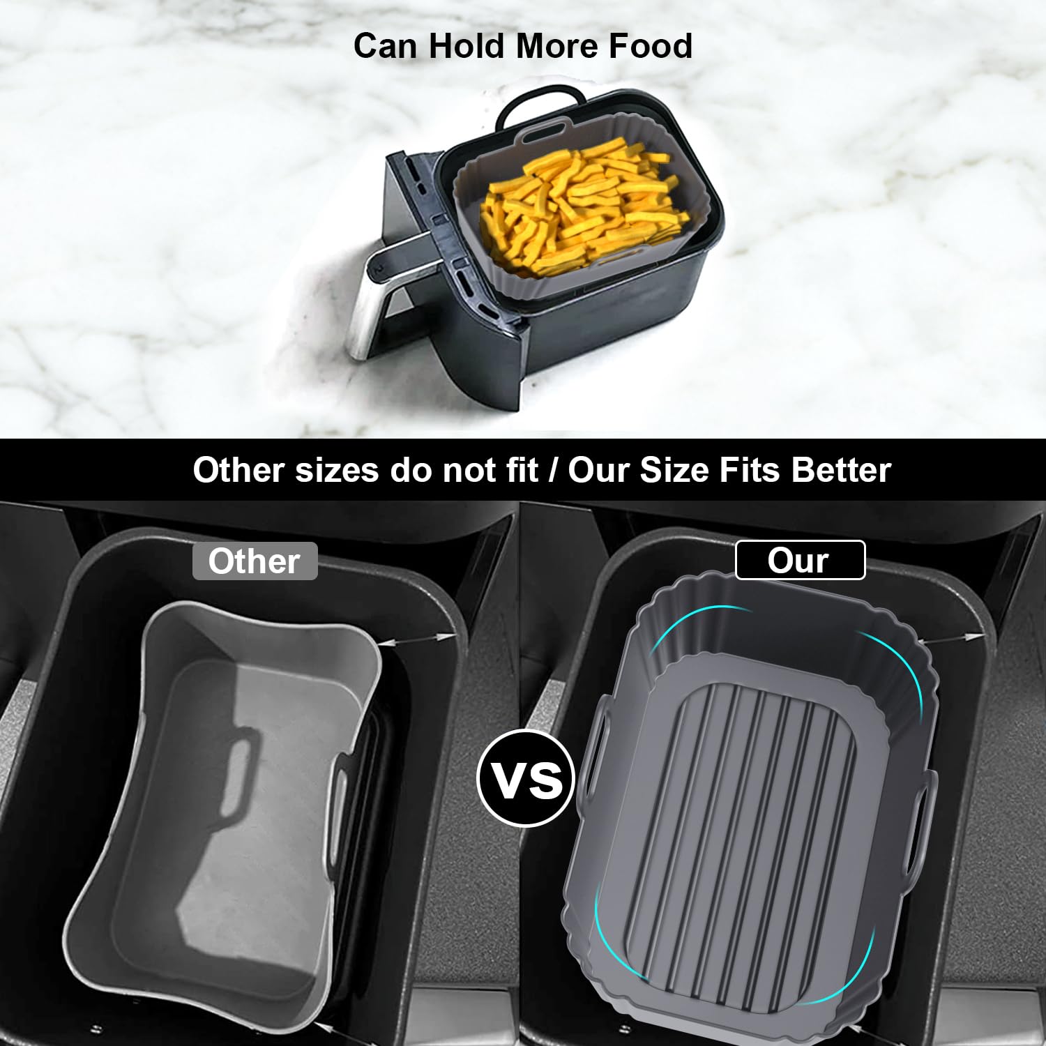 【Custom Design for Perfect Compatibility】 The dimension of this product is 8.67x5.9X2.68inches, which is high enough to leave no space of the inside of the fryer wasted. The bottom of the liner comes with raised silicone strips, which separates food from oil produced during cooking and reduces your intake of fat. It also contributes to the air circulation within the liner which helps reduce cooking time and save up on utility bills.
