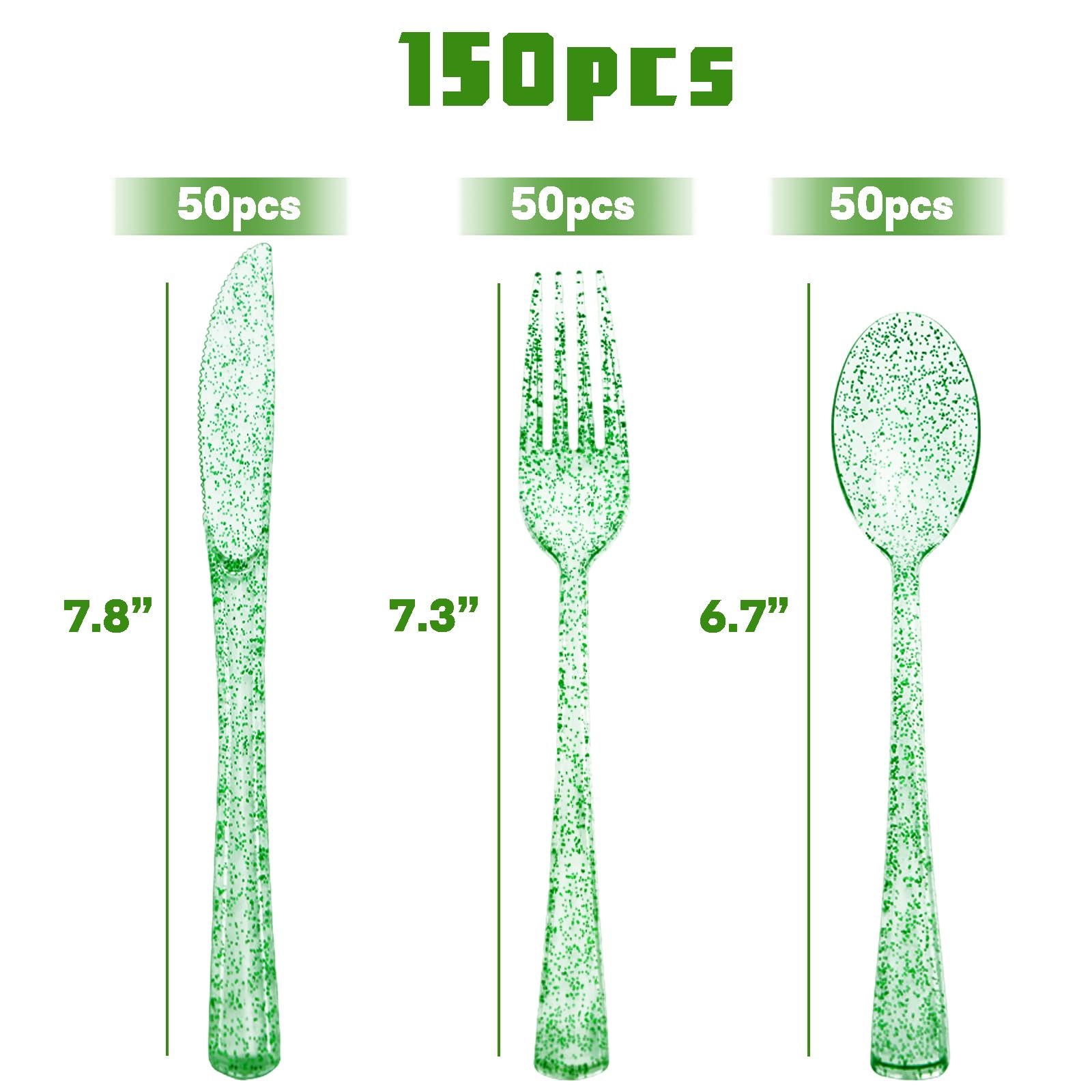 【Green Silverware Serves 50 】: This green plastic silverware includes 50 green plastic forks, 50 green spoons and 50 green knives, total 150 heavy duty plastic silverware. This pretty plastic silverware heavy duty will help brighten up your St.Patrick's Day, Christmas, wedding, birthday, shower or whatever your celebrated event is.