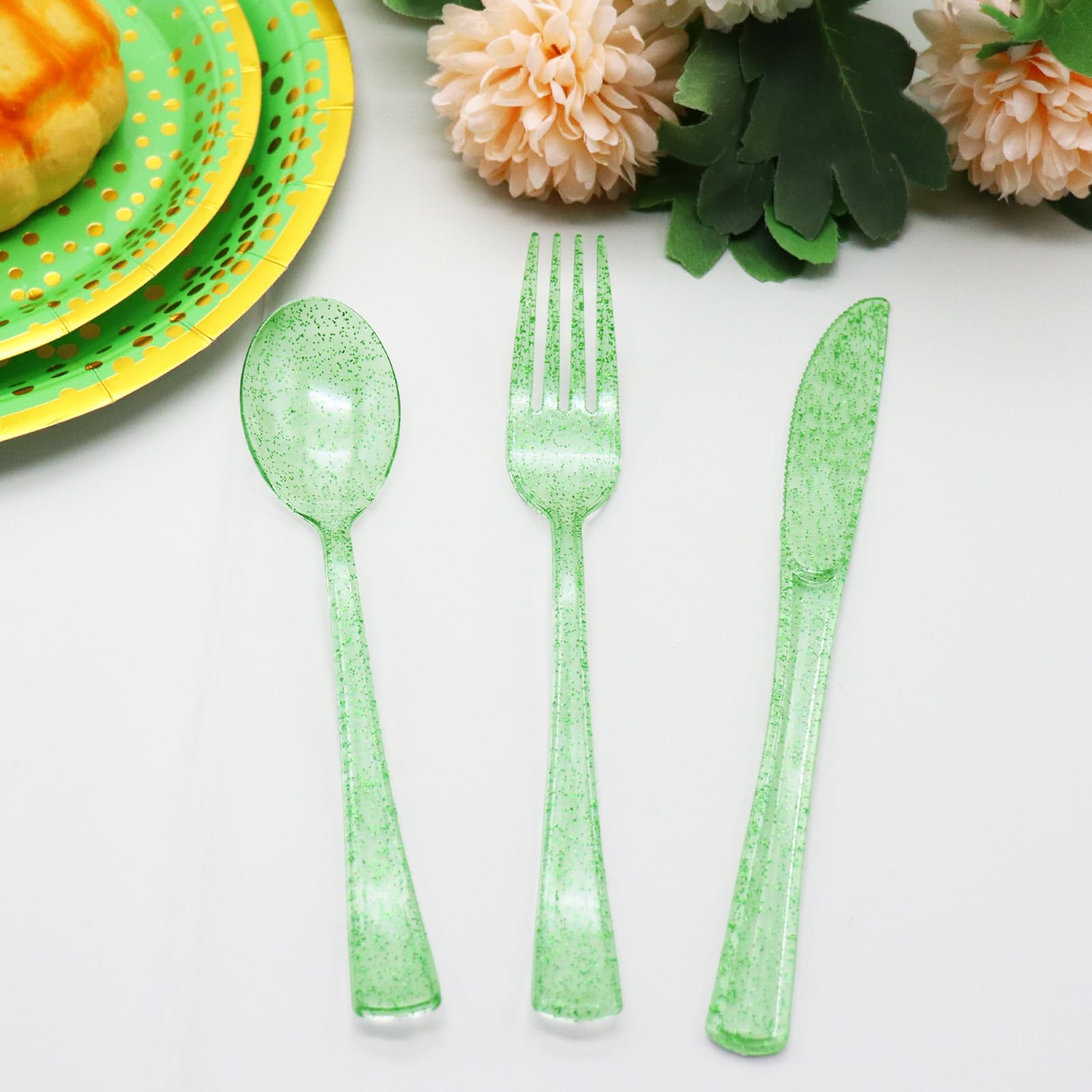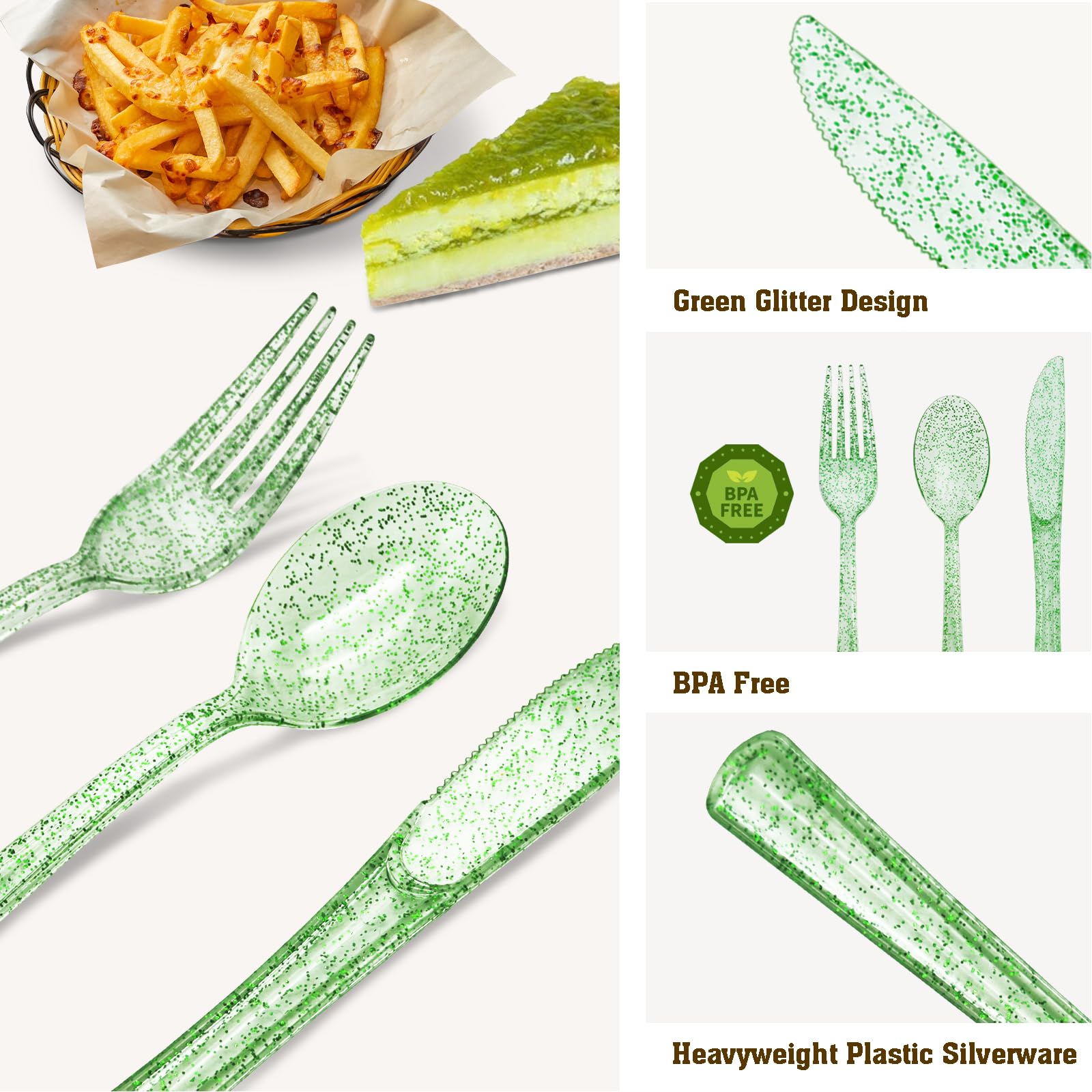 【Plastic Silverware for Party】: Green is a color full of vitality and hope, which can give people a calm and comfortable feeling.The green sparkling exterior design can add a fresh and natural atmosphere to the table. Green plastic utensil sets are not only practical tableware, but also stylish decorations that add a decorative touch to your table.