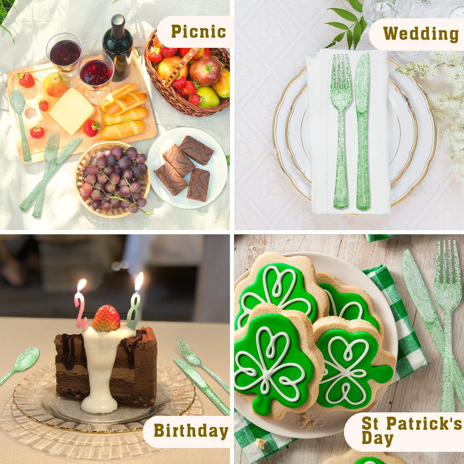 【Widely Used Occasions】: This green utensils are very suitable for a variety of occasions and uses, whether it is used for St Patrick's Day, Graduation Party, wedding, birthday,spring parties, baby shower,outdoor picnics, campus events and other occasions, you can choose this green plastic silverware to add a youthful and energetic event.