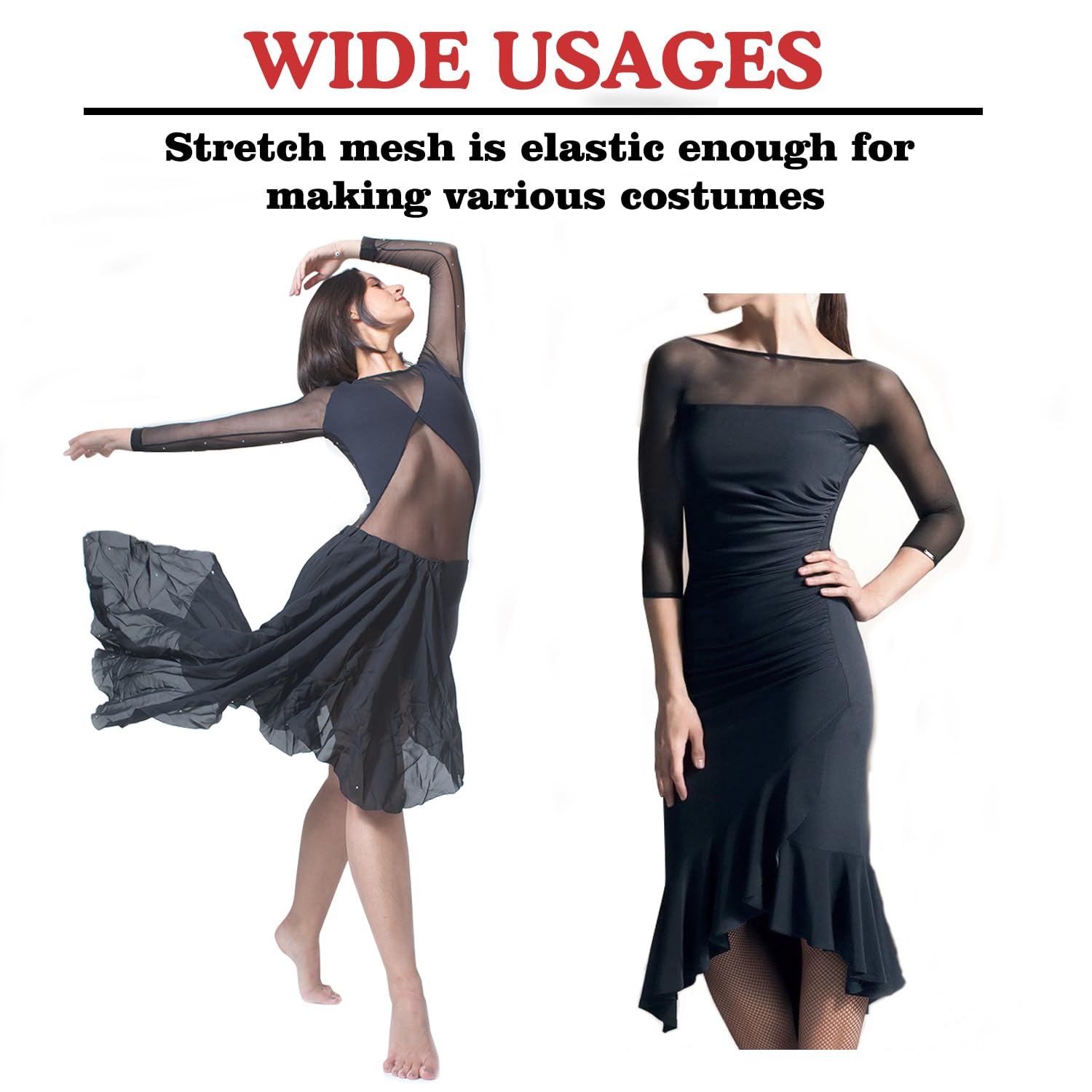 Width application: Light stretch mesh are nice for cutting into all size, making costumes, Power mesh fabric retains its shape and takes dye really well, It has a full bodied drape and flows nicely