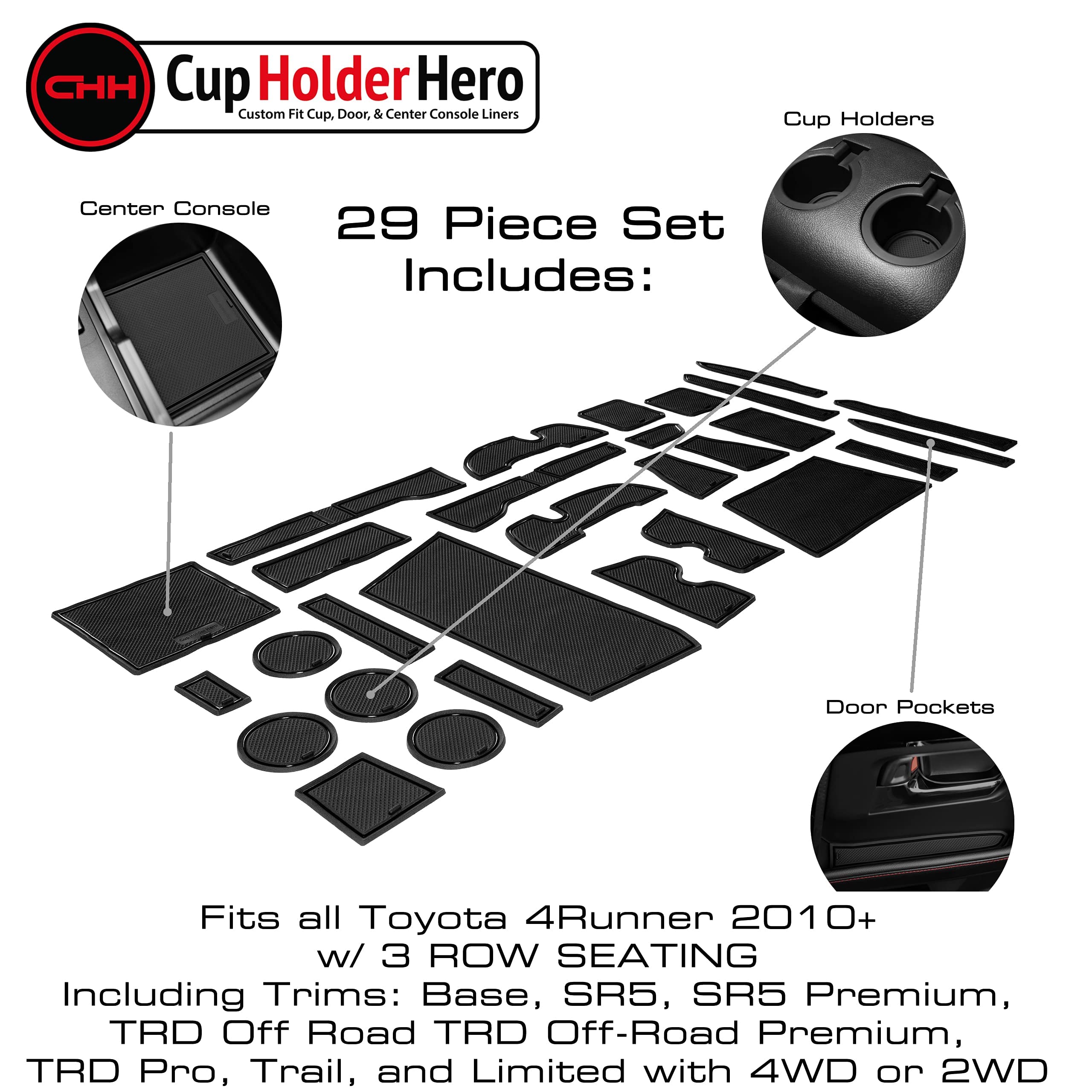 ✅YOUR INTERIOR IS COVERED - Floor mats and seat covers aren't enough to protect your automotive drink holders and center console car areas. Your new 29 piece non slip mat set protects your cup holders and door pockets to keep your vehicle fly. (Fits all 2010 2011 2012 2013 2014 2015 2016 2017 2018 2019 2020 2021 2022, 2023 Toyota 4Runner models including trim levels: SR5, SR5 Premium, TRD Off Road TRD Off-Road Premium, TRD Pro, Trail, and Limited with 4WD or 2WD (7 PASSENGER SEATING ONLY!))