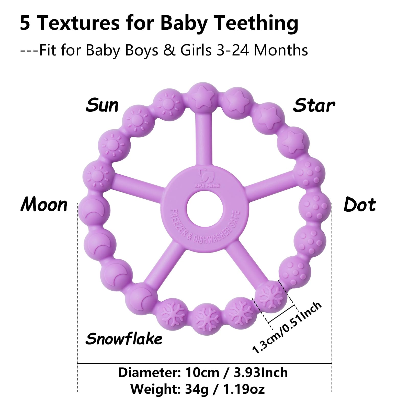 5 Teething Textures: Cute and funny teether ring toy design with 5 different textures and bristles on both sides to clean and soothe baby gums. (Sun, Star, Moon, Snowflake, Dot). Perfect baby gifts of baby essentials for newborn must-haves.