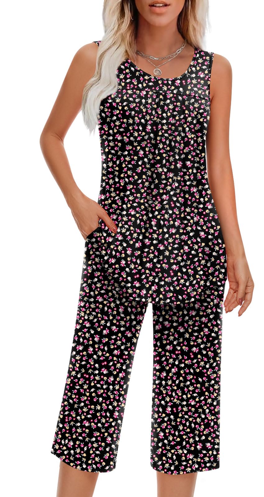 Fashion-Simple Design: Cute two piece outfits, sleeveless tops, soft nightwear, scoop neck and front pleated detailed design. Elastic waistband shorts, casual loose comfy, graceful and easeful