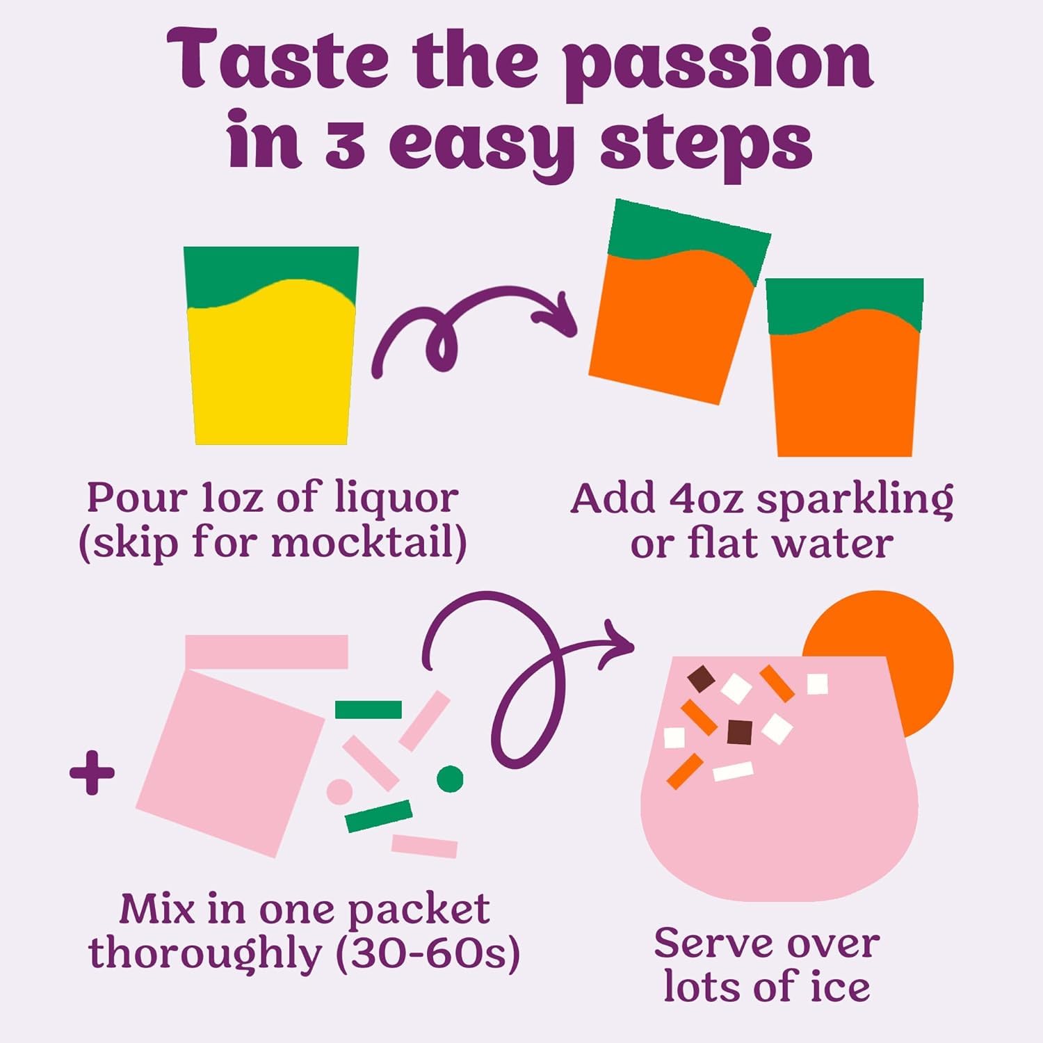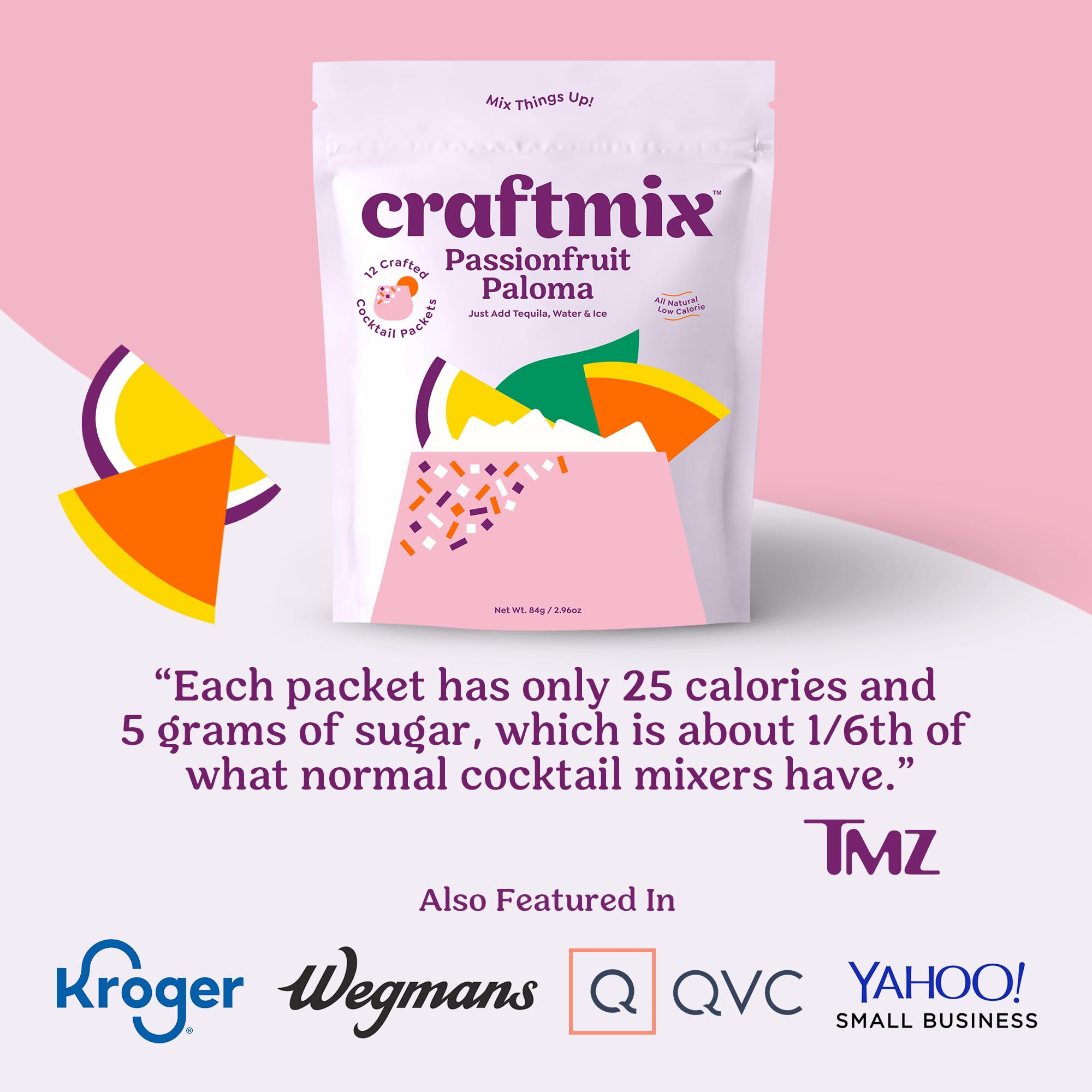 Passionfruit Paloma Cocktail Mixer: With Craftmix, just add tequila, sparkling or still water, and ice to savor the no-carb, no-sugar fruity taste of this fat-free, alcohol drink mixer made with natural ingredients in 60 seconds or less anytime, anywhere. Pack makes 24 Drinks.