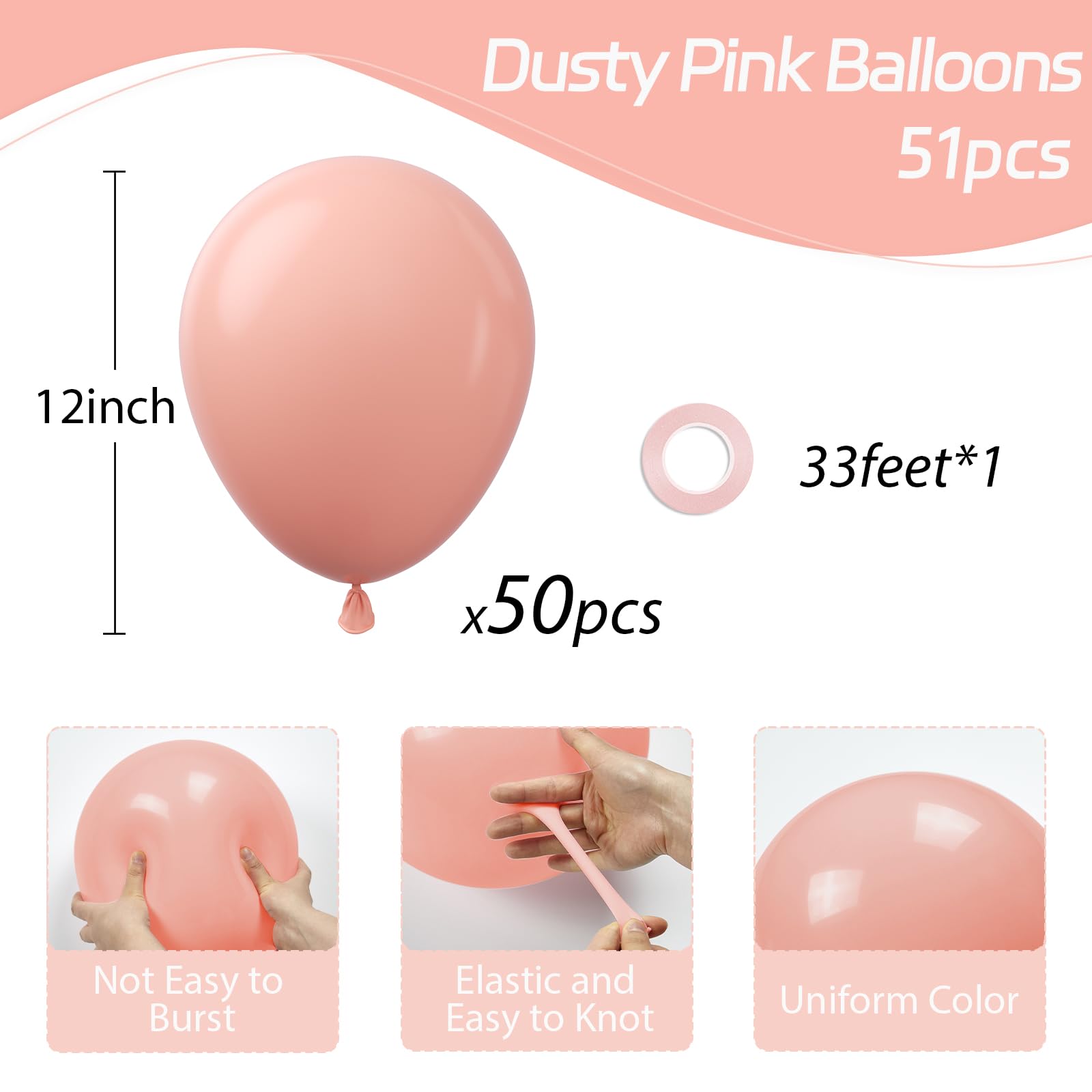 Package Include: The package include 50pack 12 inch dusty pink balloons and a roll of pink ribbon