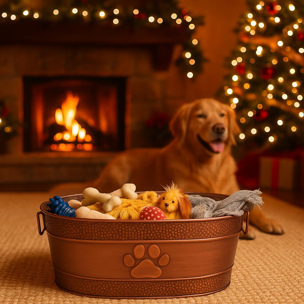 SPECIFICATIONS: Material: Heavy-duty galvanized steel large dog toy basket. Color: Antique Copper with Paw Print. Size: 21”L x 14”W x 9”H. Capacity: 25qt / 6 gallon