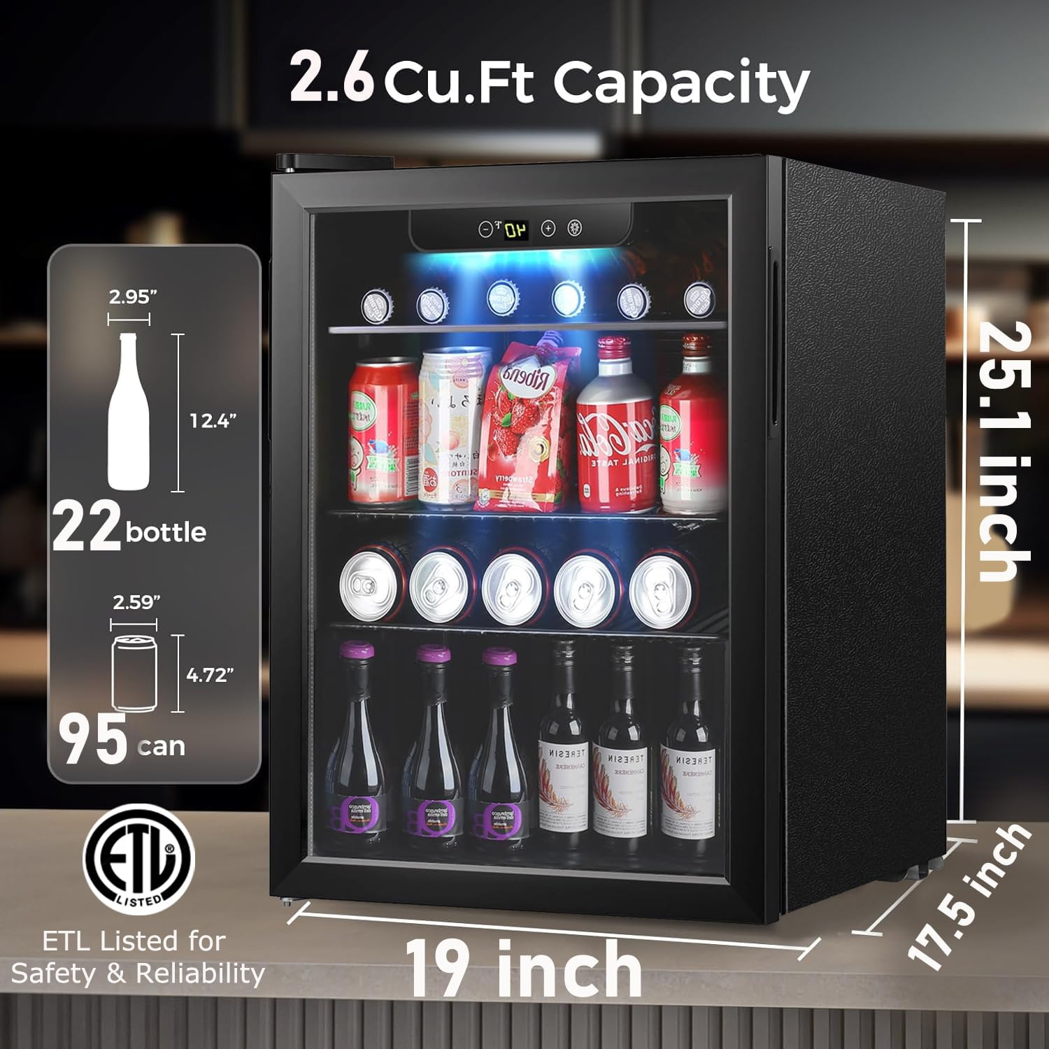 Spacious Storage: 2.65 Cu.Ft wine fridge, Spacious enough to store up to 95 cans. Beverage refrigerator ETL approved is perfect for parties, game nights, or family gatherings. The adjustable shelves accommodate various bottle sizes.