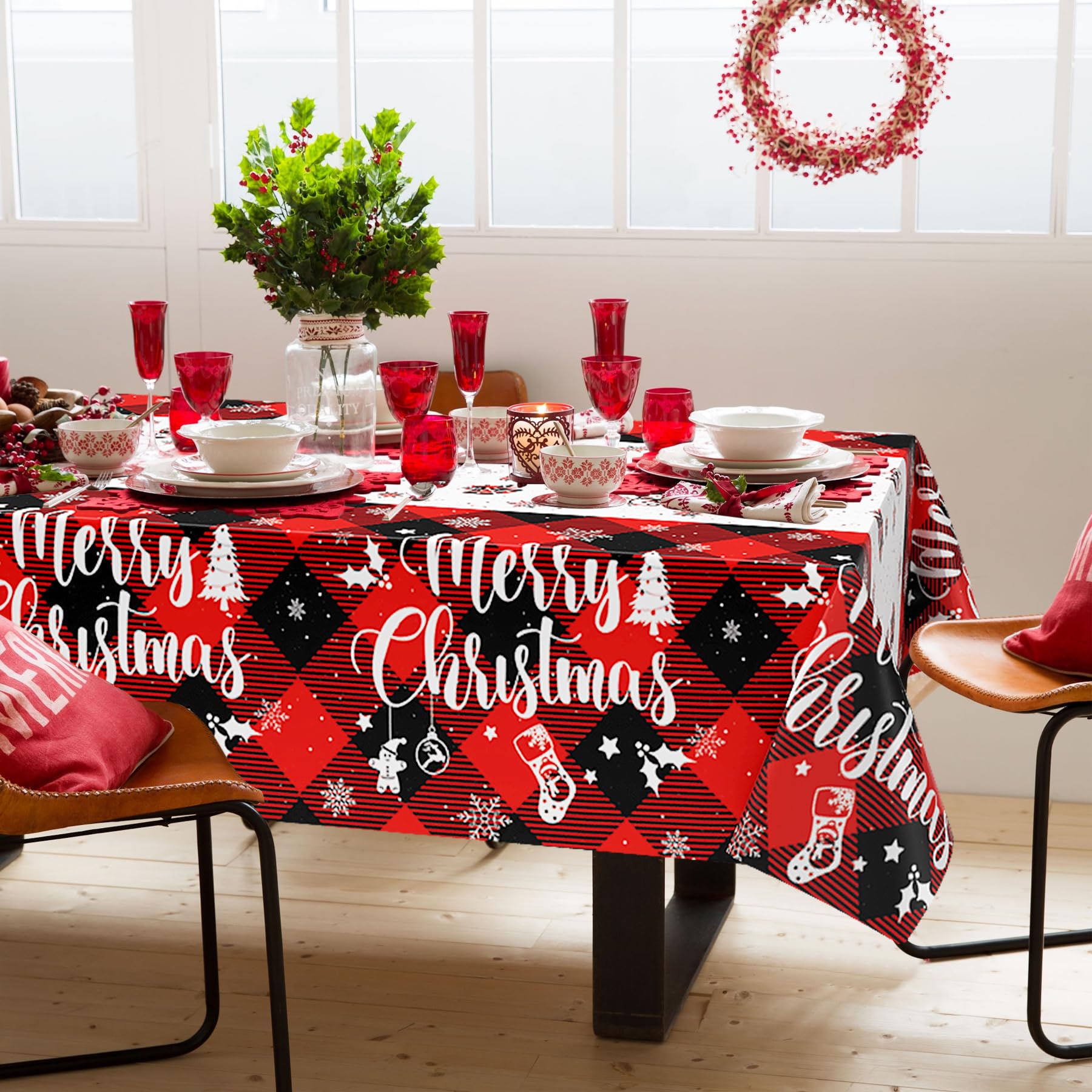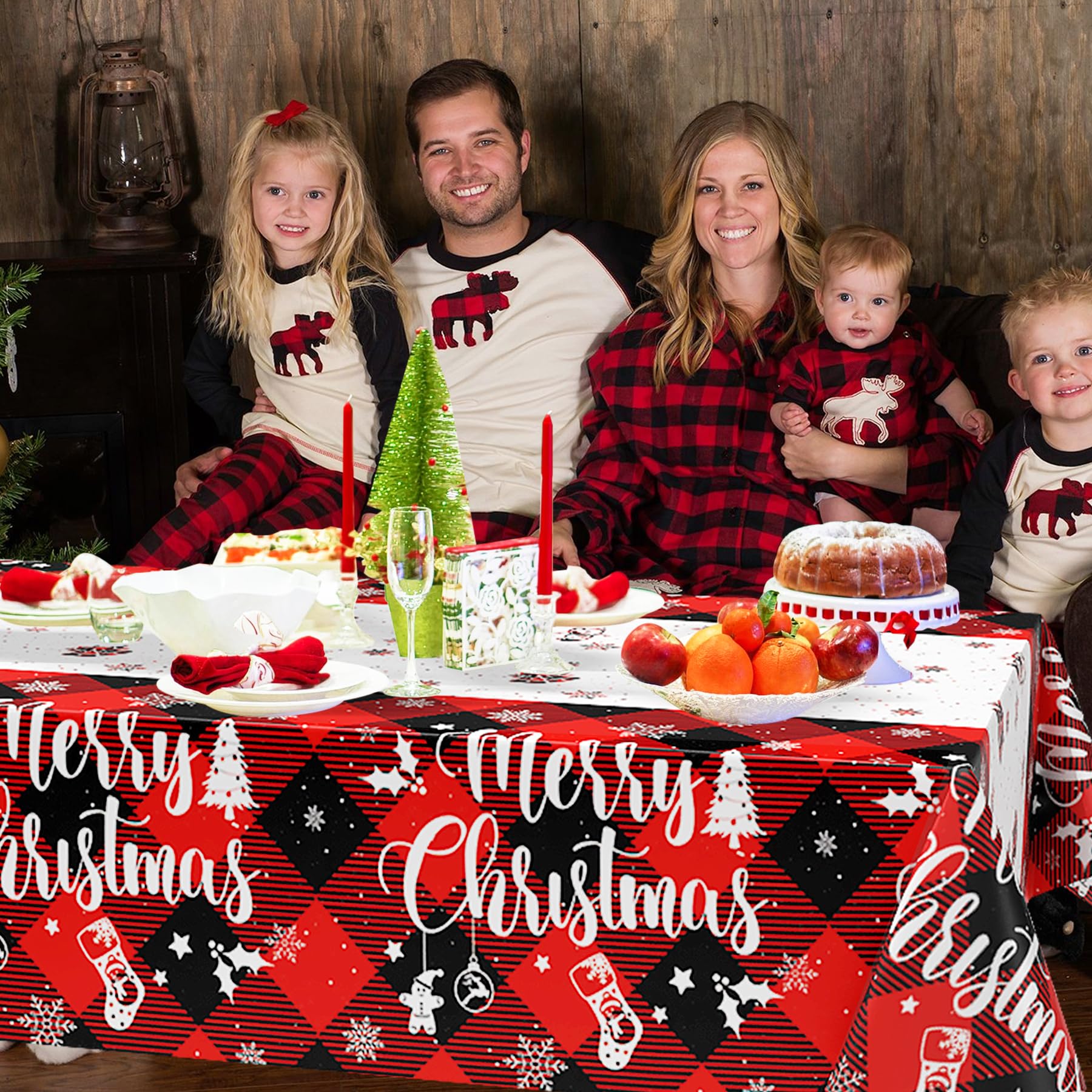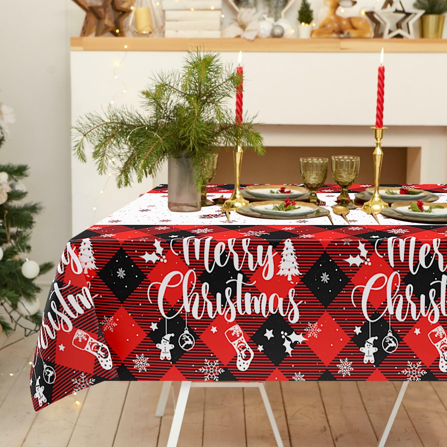 Cute Design: The Christmas tablecloth is patterned with traditional red and black plaid around the edges and white in the middle part, and the surface incorporates Christmas elements such as snowflakes, snowmen, bells, socks and so on. The colors are bright and vivid, adding more warm and festive atmosphere to your party. Perfect choice for your Xmas party decorations
