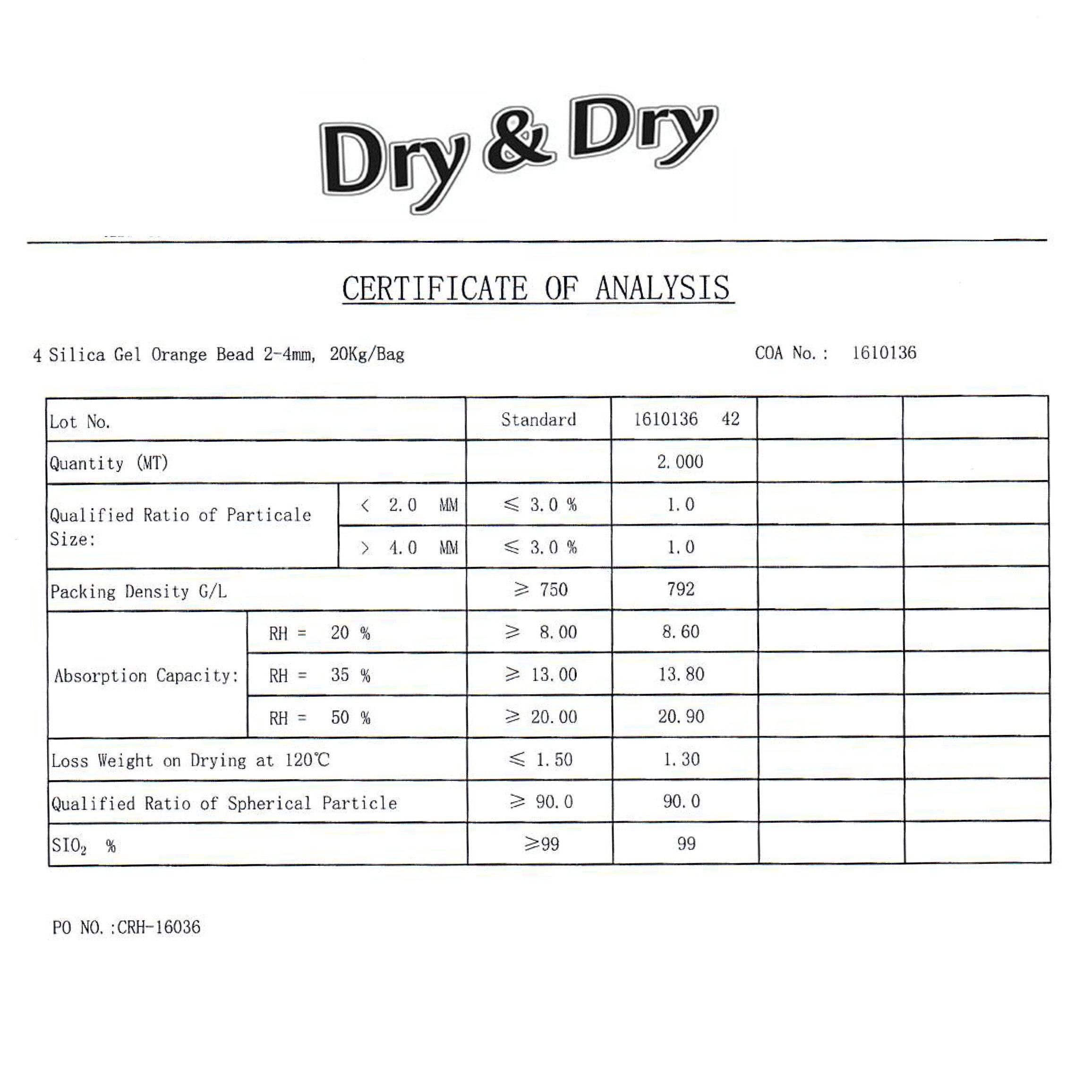 Indicating Orange silica gel will change to Dark Green when 50-60% absorbed with moisture; Still almost half more capacity is left to absorb moisture even after color change; Orange Silica Gels are free of cobalt chloride