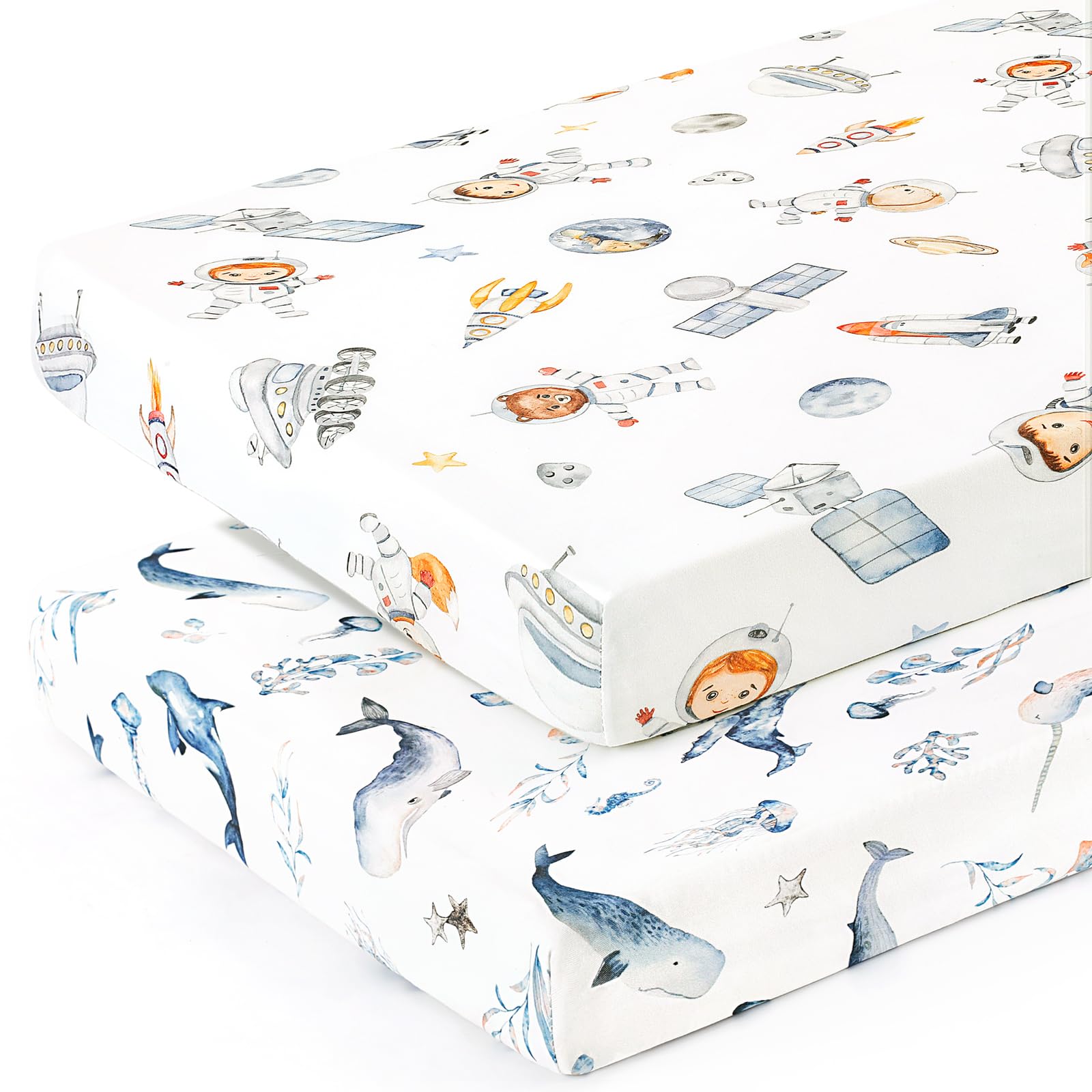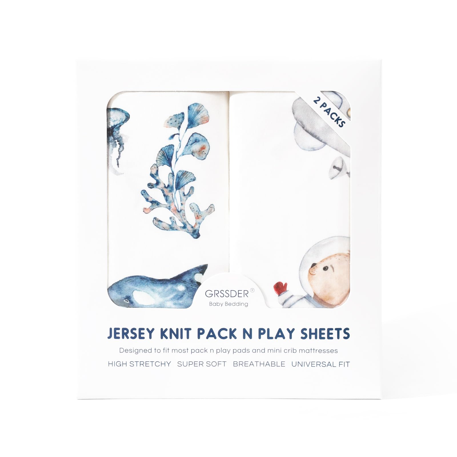 Bring home your little angel to pack and play mattress sheets that's as sweet as they are with crib sheets for girls from GRSSDER. The Cute Sea Fish & Space printed design add the perfect touch of cuteness, and leave you open to a world of decorating possibilities for baby's room! Why choose GRSSDER toddler bed sheets ? Soft and Breathable: Super soft jersey knit Our pack n play mattress pad sheet / mini crib bedding sets are composed of stretchy, soft and breathable fabric, made from high quality jersey knit. Baby love our crib mattress sheet, as they are safe, comfortable and super soft on baby's skin. Adaptable Elasticity: Fits multiple graco pack n play mattress and pack and play mattress pad. GRSSDER crib sheets boy and girl securely fit for any standard play pin portable mattress pads, not only does this allow our fitted crib sheet to fit a wider selection of playpen mattresses, but ensures the sheet will never come undone if your baby rolls around while atop playard, mini pack n play. Up to 6" deep pocket fit all 1"-6" pack n play, mini crib and playard mattress. A Fit of Comfort: Snug & Sound. Thanks to the 360-degree elastic band, we created crib mattress cover that will remain fit and snug all night long. Enabling you to rest assured that your baby is safe, snug and sound. Our feature ensures that there is no bunching, ill-fitting, or too-loose fit on mini crib sheets fitted. We sincerely thank each and every buyer for purchasing our baby sheets. We take pride in every single stitch and weave because we understand the importance of items that are used in your home every day. We don’t just make fabrics, we make products for your comfortable healthy lifestyle.
