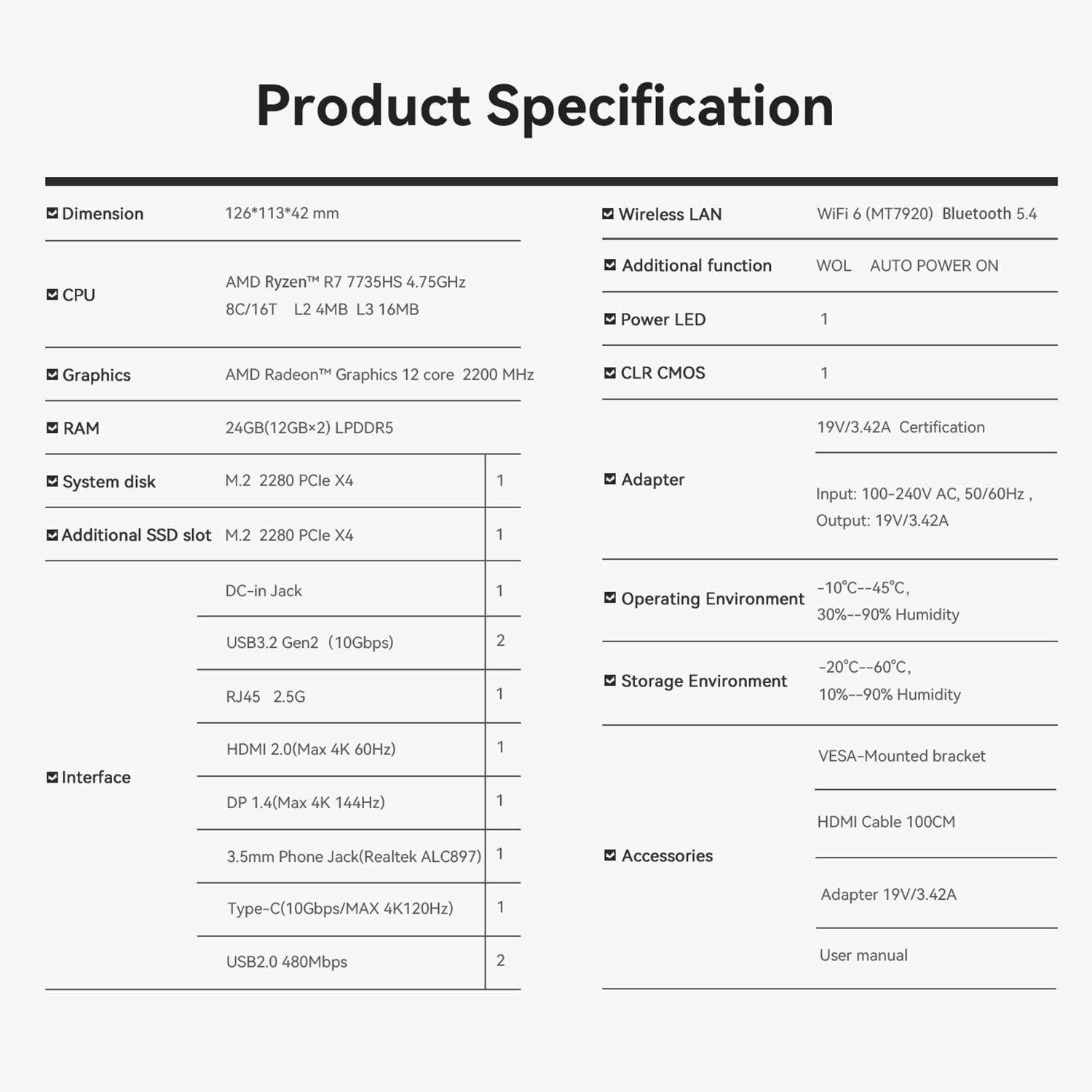 【Rich Interfaces & Stable Connectivity】Beelink 7735HS mini pc is equipped with 1*HDMI, 1*DP, 2*USB3.2 (10Gbps), 2*USB2.0 (480Mbps), 1*Type-C, 1*DC jack, 1*RJ45 2.5G port and 1*3.5mm audio jack, allowing easy connection to various peripherals. It features WiFi 6, Bluetooth 5.4 and 2.5G LAN, providing fast, stable wireless/wired connections to meet your work, entertainment and gaming needs.