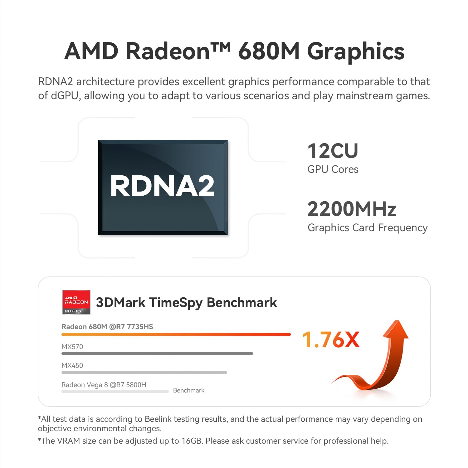 【7735HS High Performance】Beelink SER5 MAX mini pc is equipped with AMD Ryzen 7 MAX 7735HS CPU (8 cores/16 threads, up to 4.75GHz). Compared to the Ser5 Pro 5800U, it delivers 23% higher multi-core performance, effortlessly handling office tasks (spreadsheets, PPT, emails), coding, web browsing, photo/video editing (PS, PR, AI) and light gaming (CSGO, PUBG, DOTA 2, LOL).