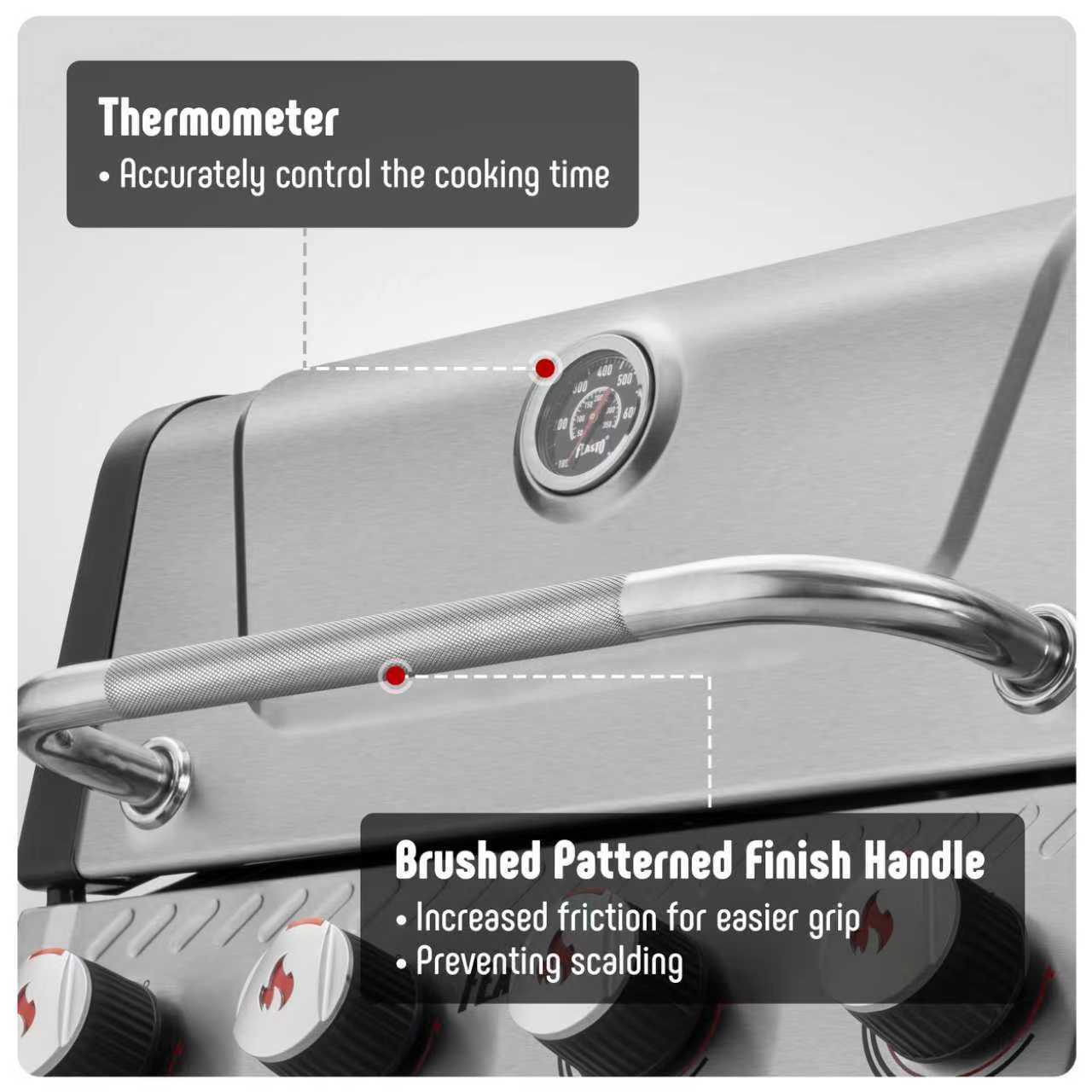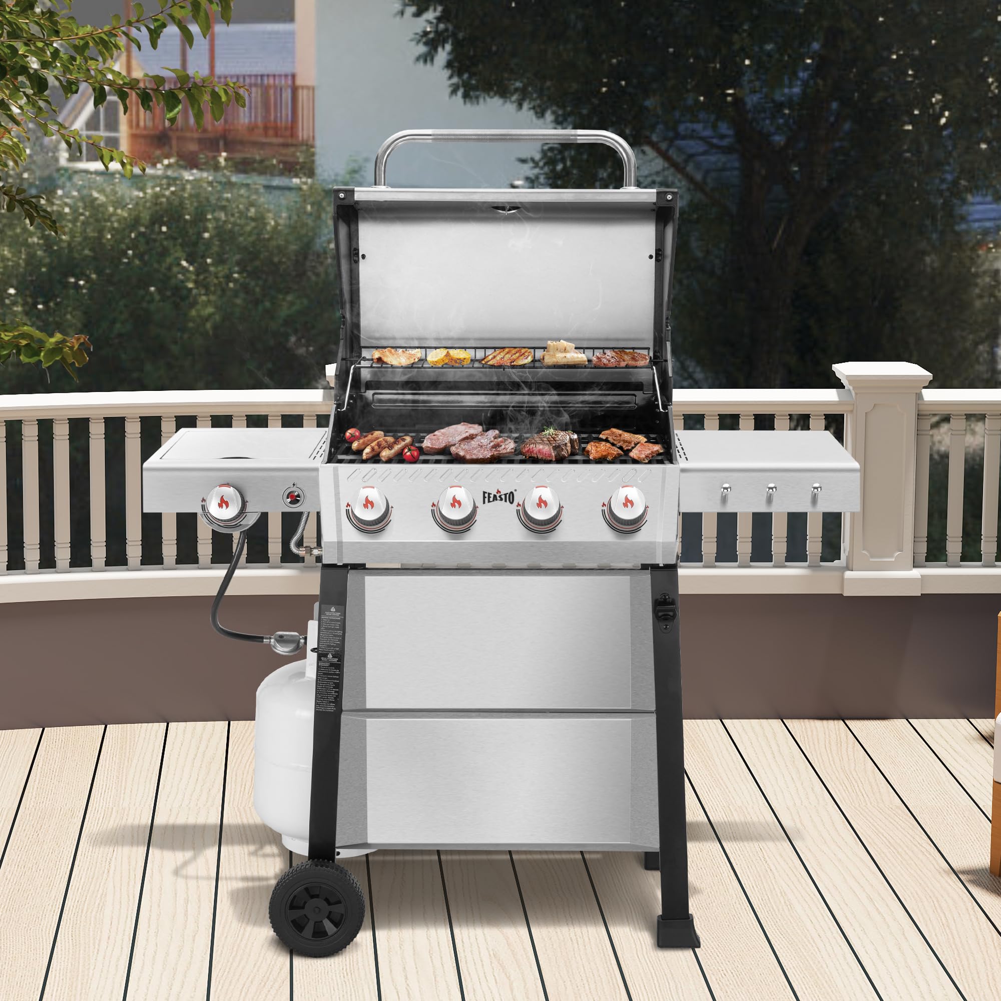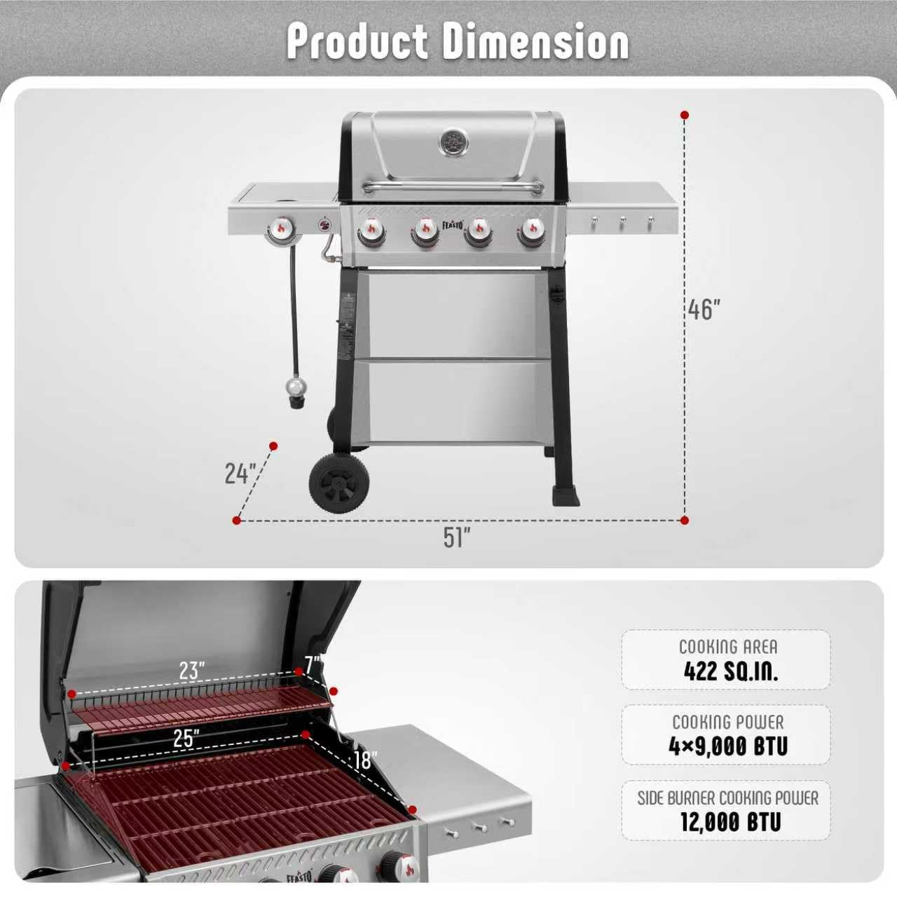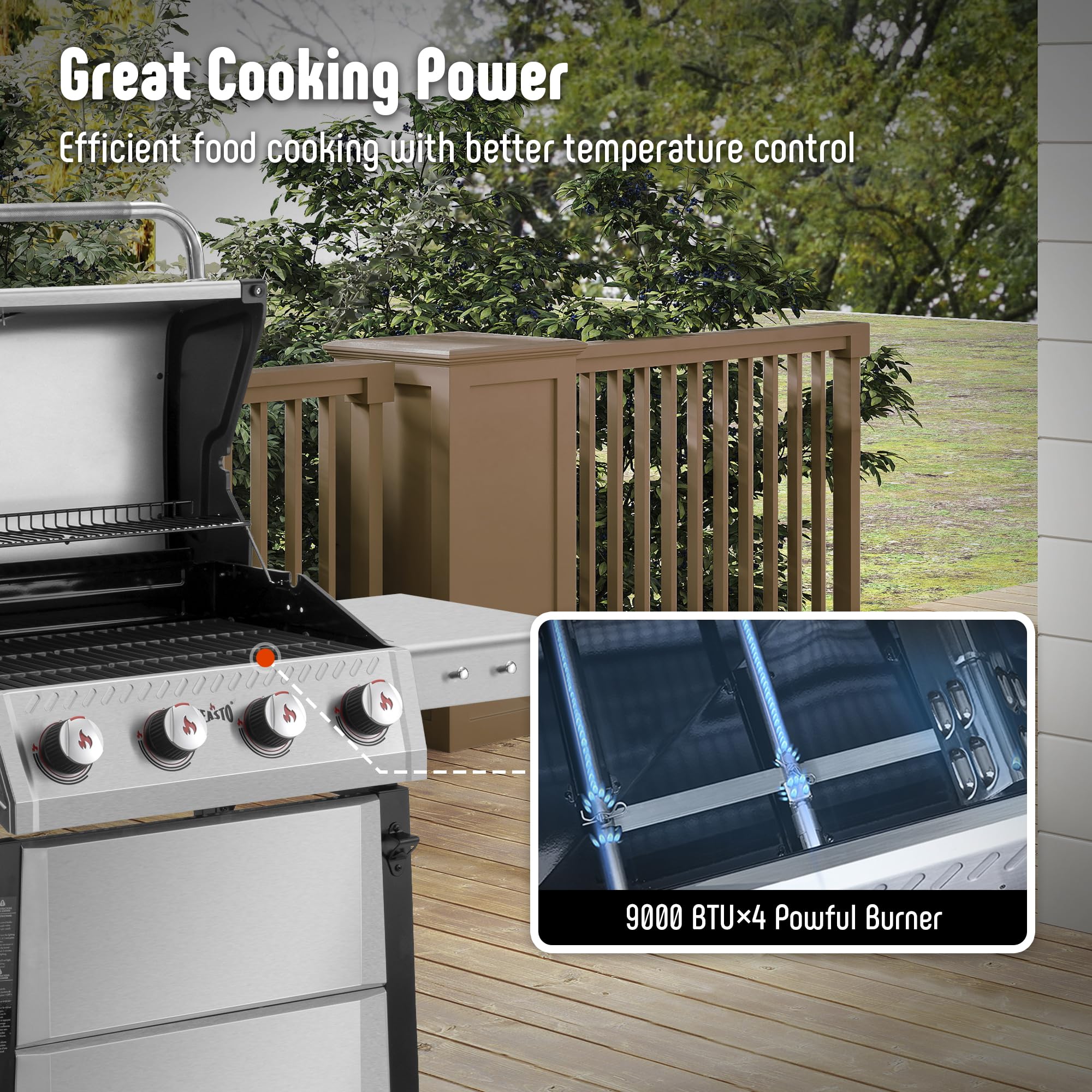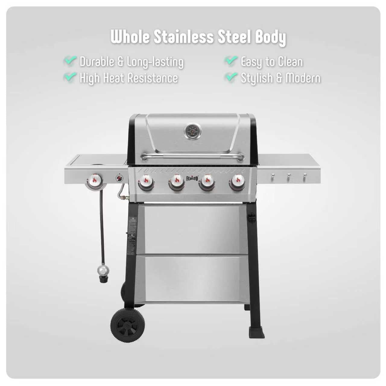 Stainless Steel Material: The propane barbecue grill built with all stainless steel with 4 durable stainless steel burners, with a total output of 36,000 BTU,ensuring long-lasting performance and even heat distribution
