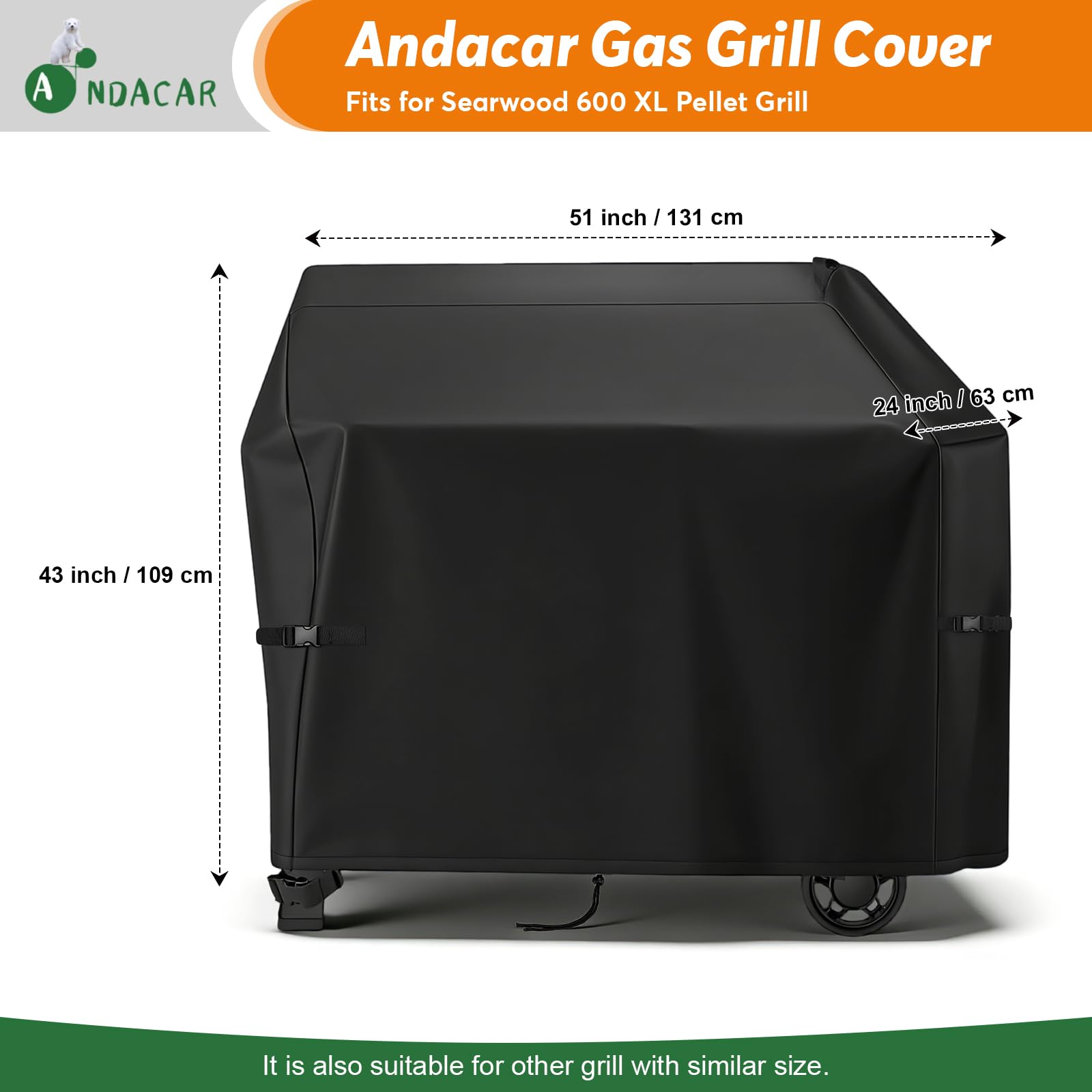 PORTABLE GRILL COVER SIZE: 51"L×24"W×43"H; Fit for Weber searwood 600 XL pellet grill, replacement of weber 3400146; Please measure your grill before purchasing.