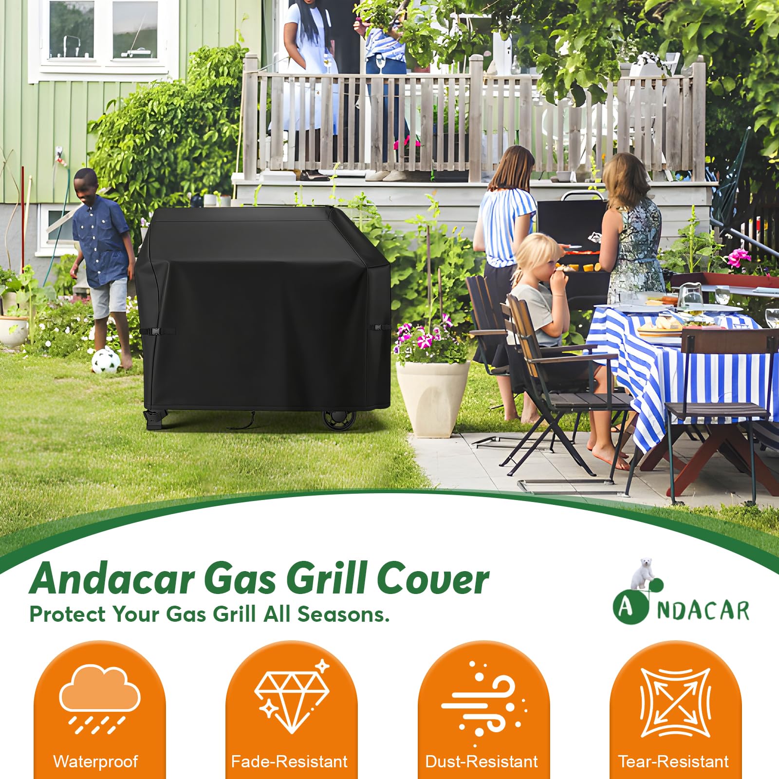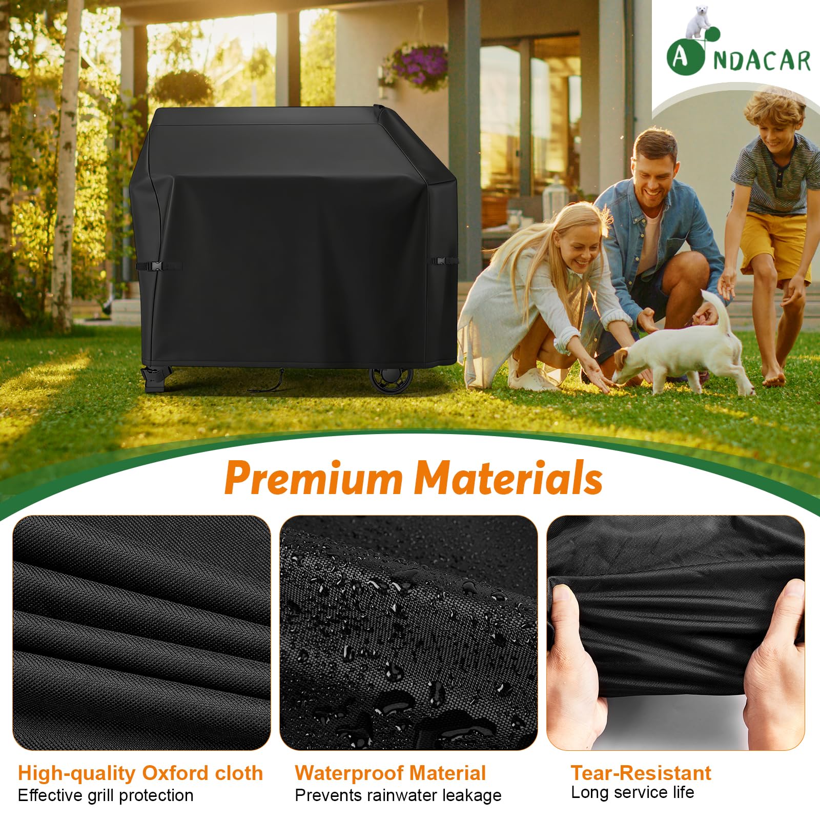 PREMIUM MATERIAL: BBQ grill cover is made of heavy-duty 600D oxford fabric with PU coating, protect your gas grill from the impact of harsh weather conditions, resists UV, tearing and cold cracking, durable.