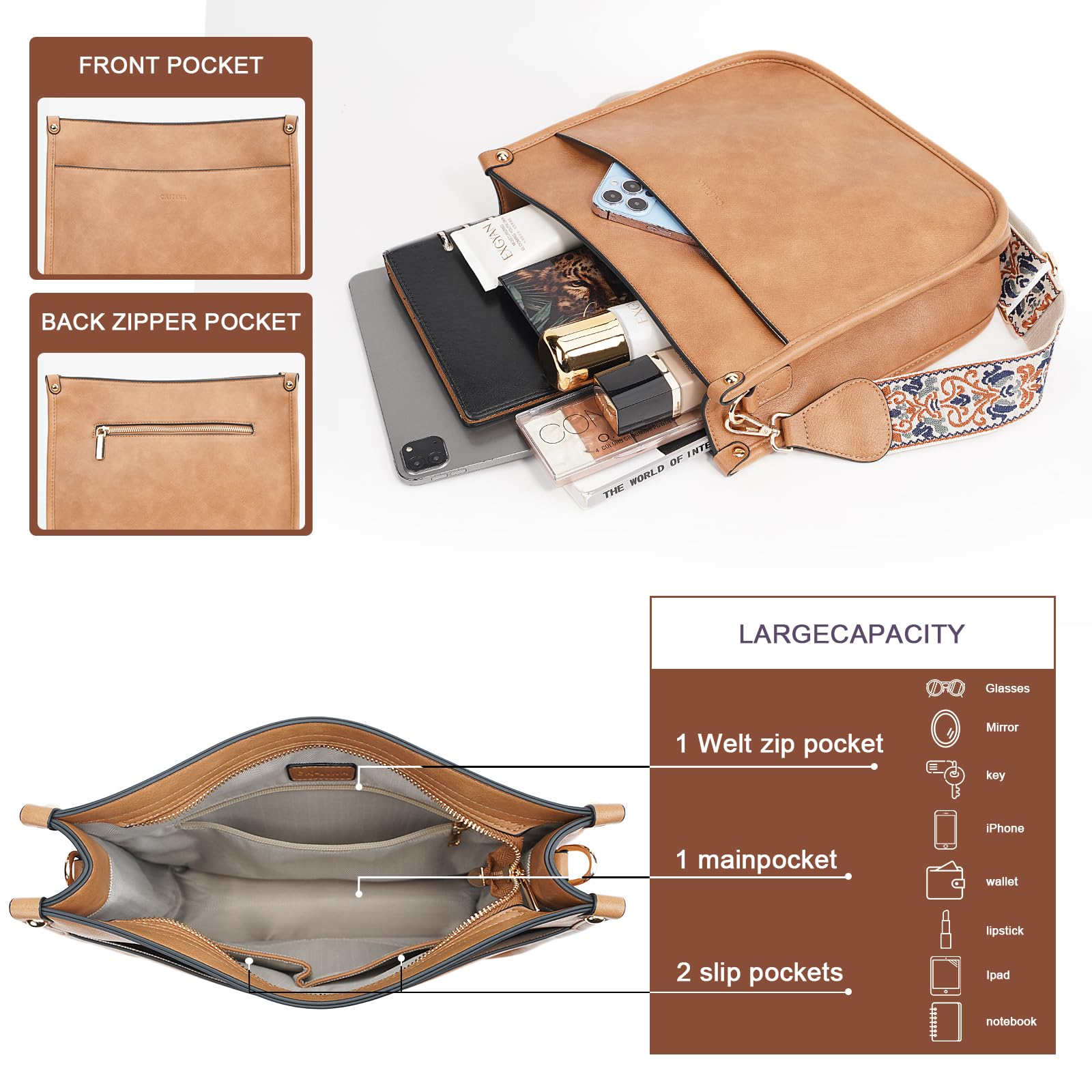 ✔【Crossbody Bag Dimension&Structure】This crossbody handbag dimension:(L) 12 x (W) 3.5x(H)10inch,weight about 0.61kg / 1.34pounds,Internal structure is one main compartment including 1 main pocket,1 inner zipper pocket,2 slip pockets-cell phone pocket and ID card slot.External structure including 1 metal magnetic buckle pocket and 1 back anti-theft pockets,come with metal zipper closure,main pocket and back pocket antitheft zipper design-double antitheft to protect your property safety.