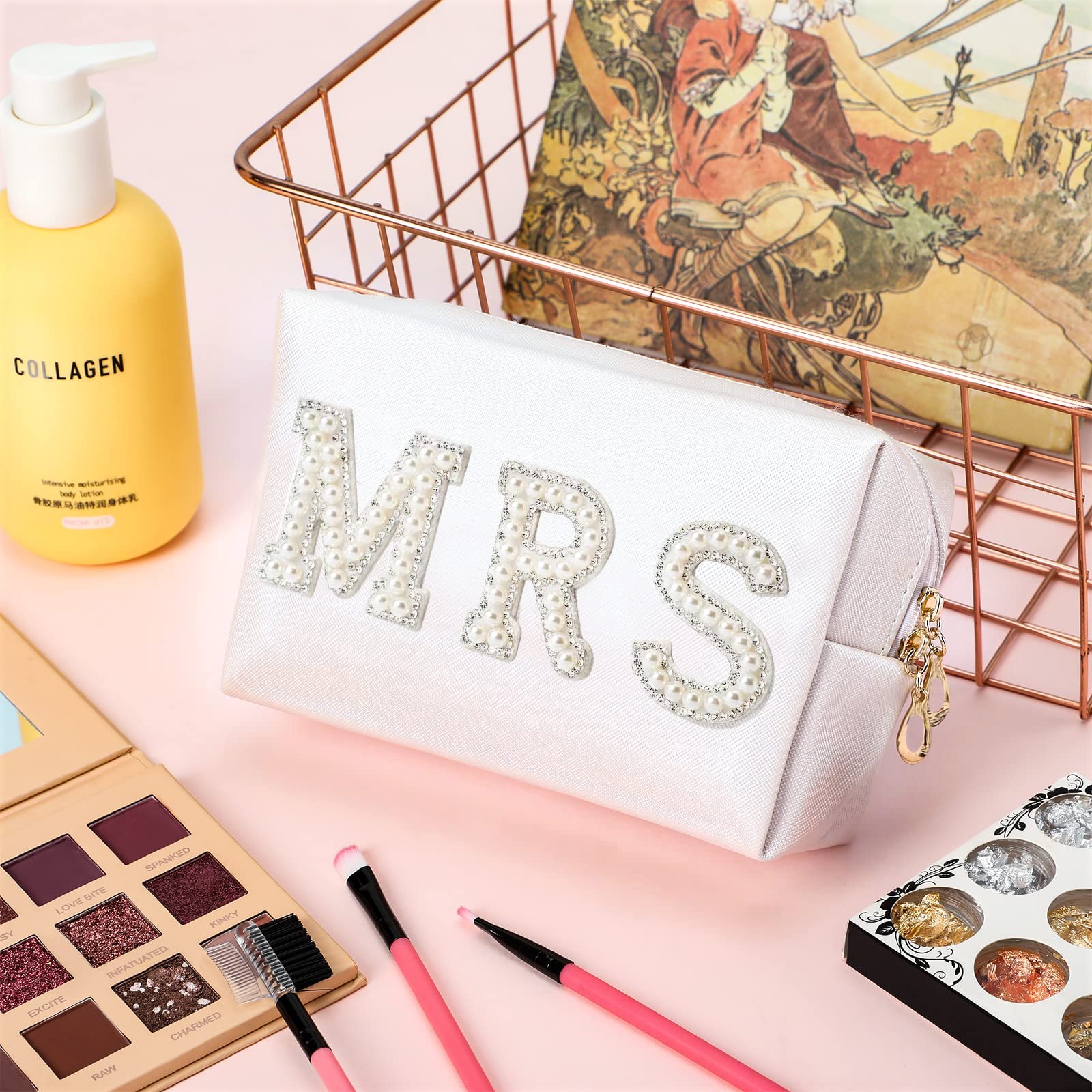 ELEGANT DESIGN: The bright pearls and bling rhinestones patch letter "BRIDE" and "MRS" make up bag are simple and elegant to make owner more attractive.