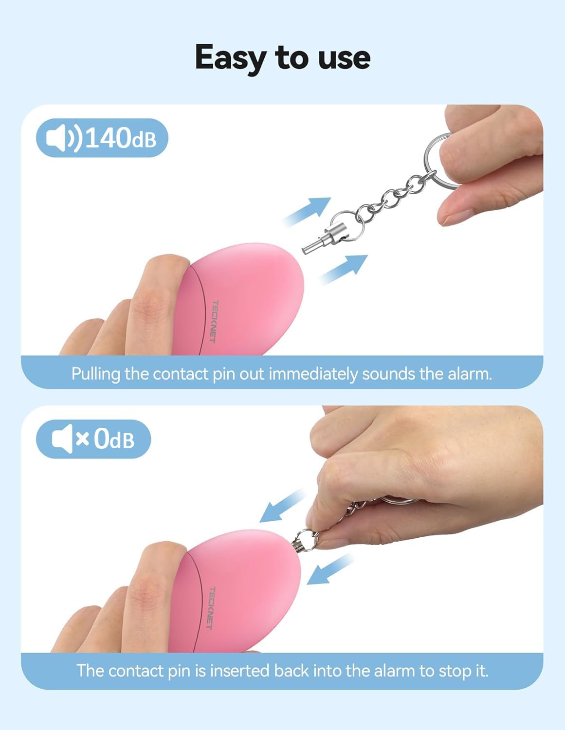 IP44 Waterproof Personal Alarm: Our personal safety alarm is made of high quality ABS material, which is resistant to drop, pressure and high temperature, and has a waterproof rating of IP44. Whether you are running late at night, hiking in the rain or snow, or going out for a camping trip, always have the TECKNET personal safety alarm by your side.