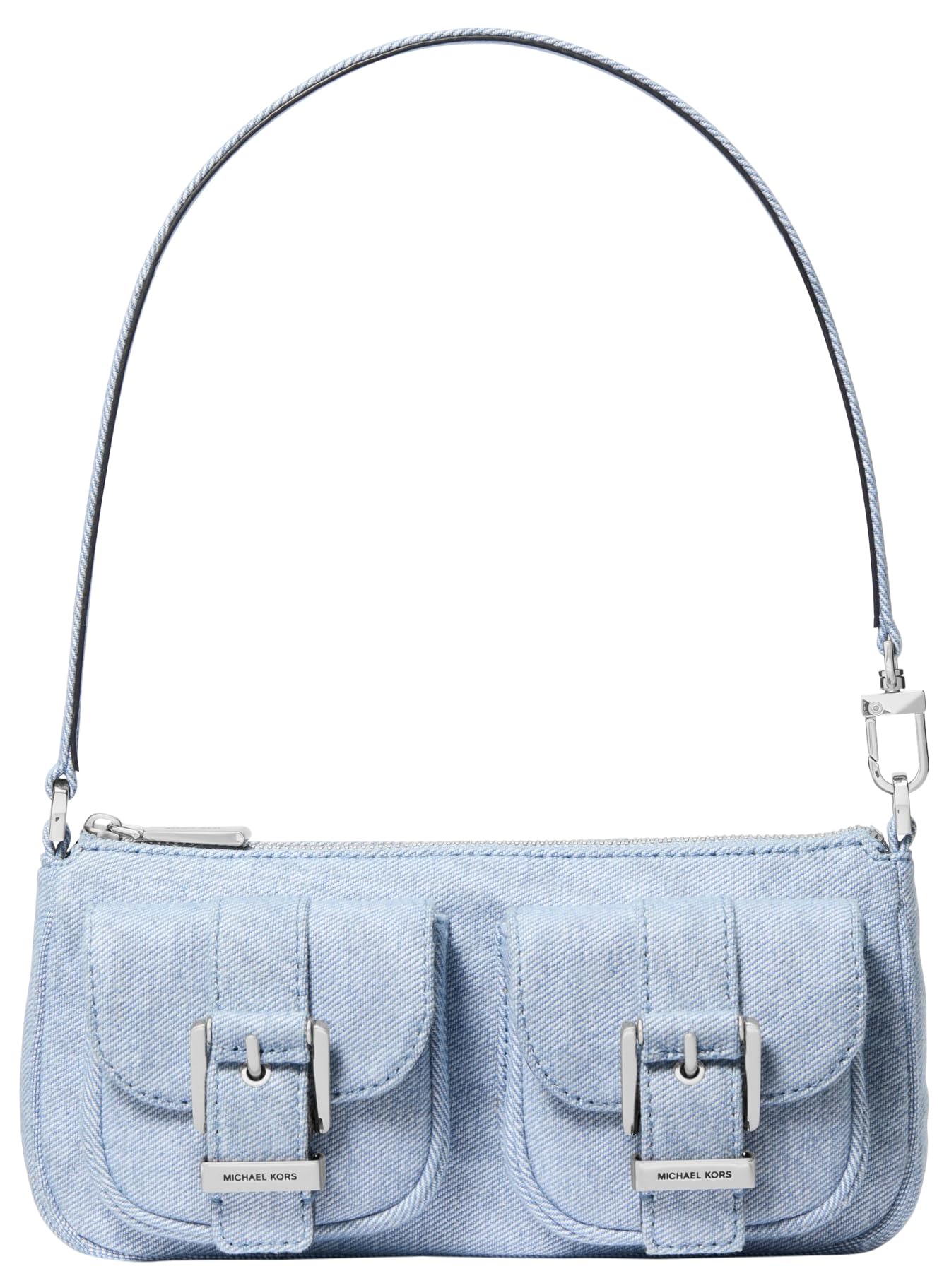 Materials: Made from cotton denim with silver-tone hardware Attention to Details: Exterior front snap pockets, zip fastening and polyester lining. 9”W X 4.25”H X 1.75”D with an 8.5" handle drop